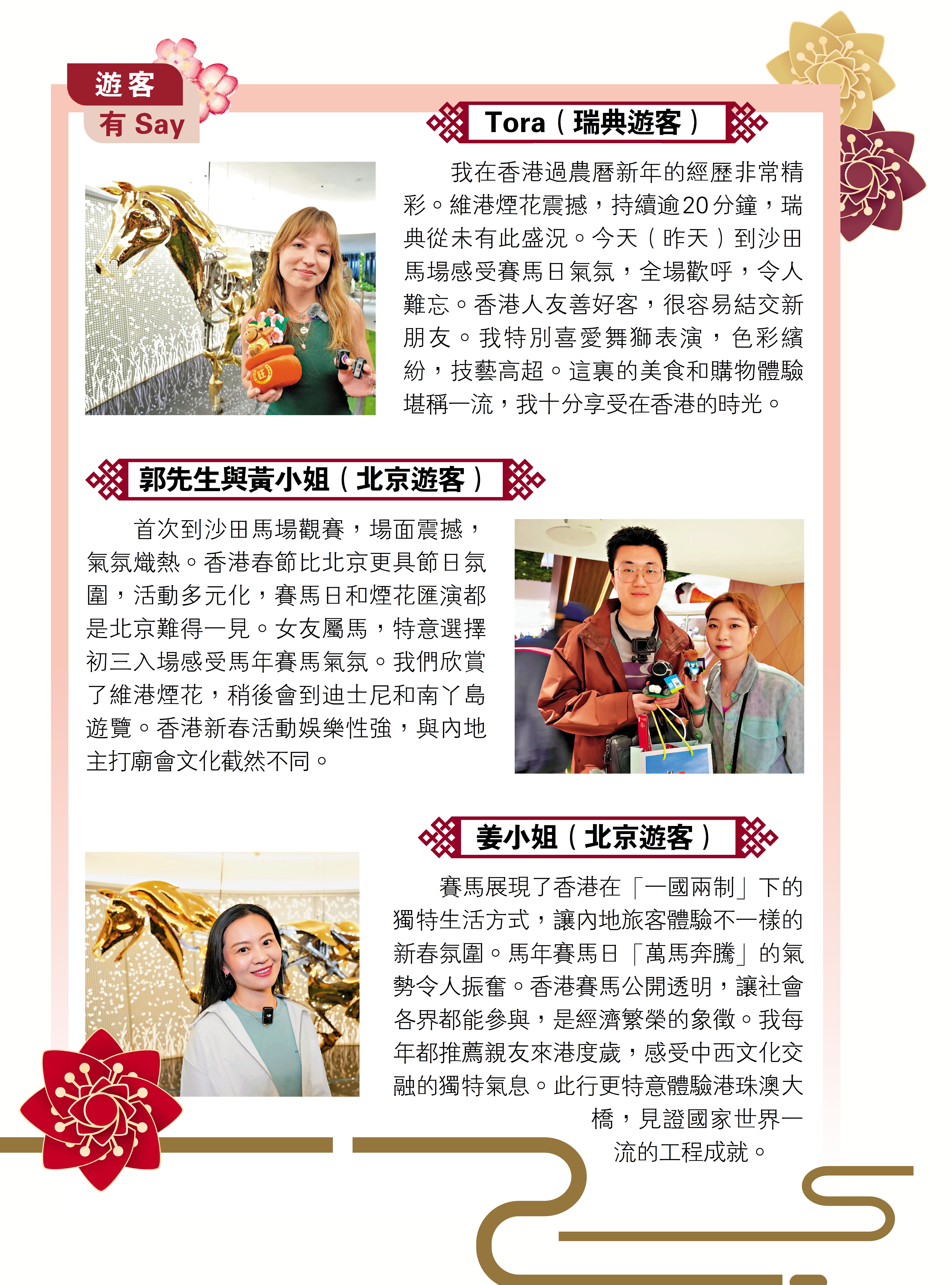 賽馬展現了香港在「一國兩制」下的獨特生活方式,讓內地旅客體驗不一樣的新春氛圍。馬年賽馬日「萬馬奔騰」的氣勢令人振奮。香港賽馬公開透明,讓社會各界都能參與,是經濟繁榮的象徵。我每年都推薦親友來港度歲,感受中西文化交融的獨特氣息。此行更特意體驗港珠澳大橋,見證國家世界一流的工程成就。
