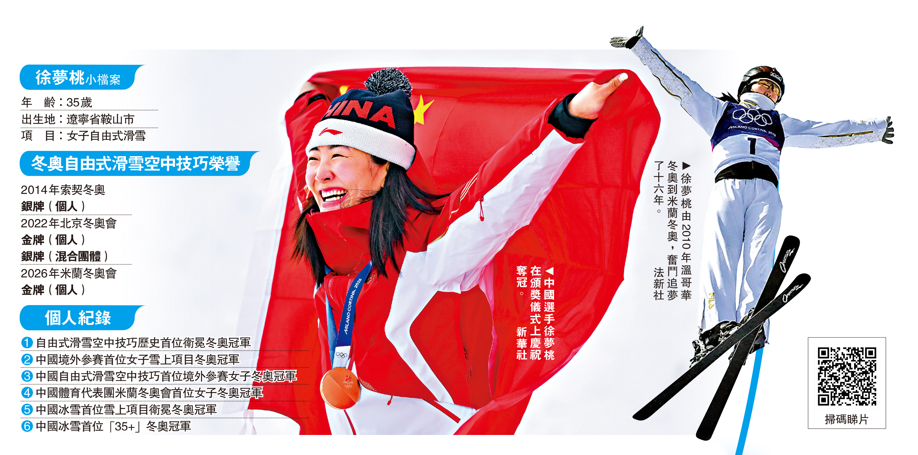 18日,35歲的徐夢桃在米蘭冬奧會自由式滑雪女子空中技巧決賽中成功衛冕,成為中國隊歷史上年齡最大的女子冬奧冠軍。五戰冬奧的徐夢桃表示,只要心懷夢想,任何時候都是當打之年。「姐還有空間,現在還不到說再見的時候!」