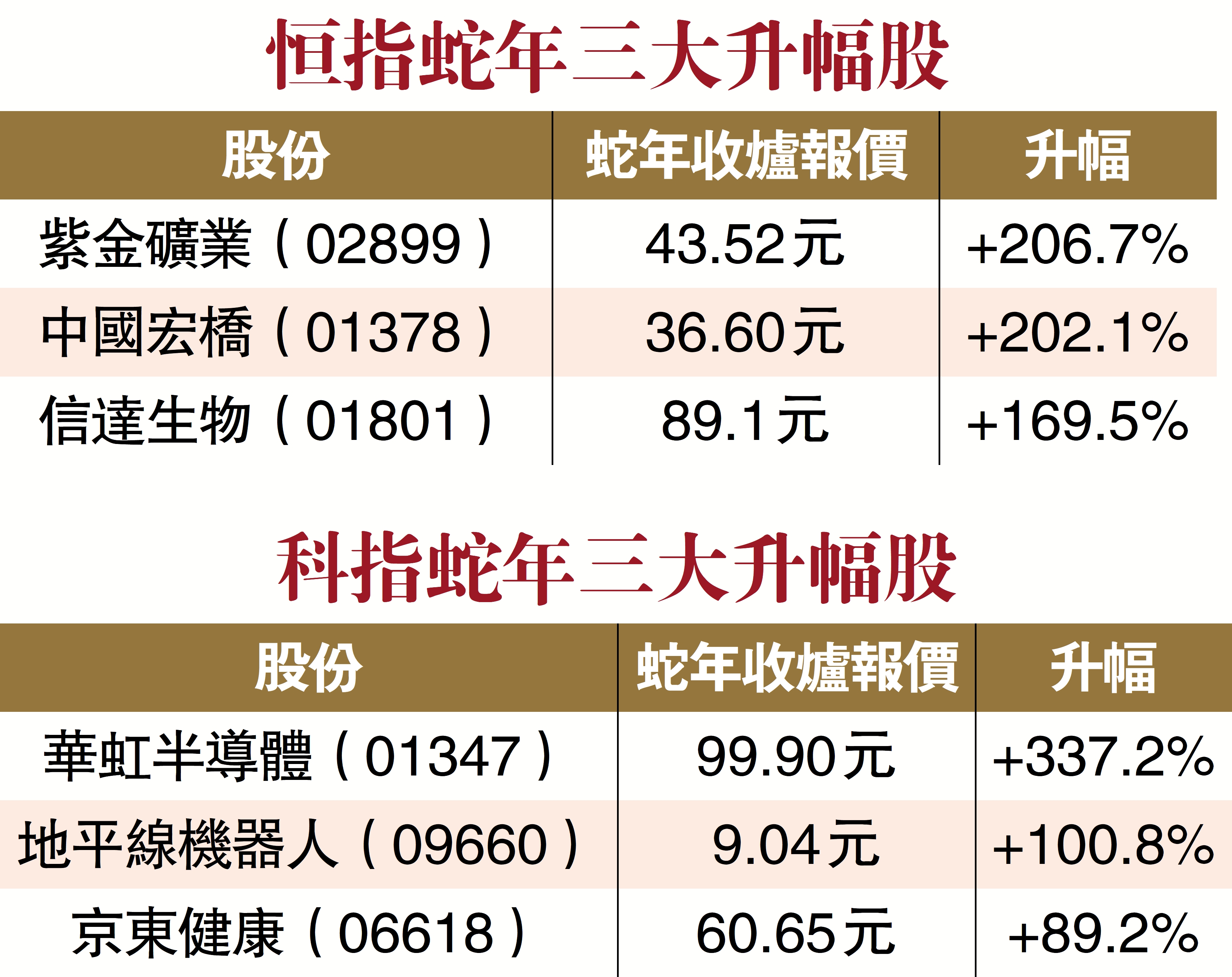 在蛇年的下半年,港股看似是有波幅無升幅,但實情是非常精彩。蛇年恒指錄得32%漲幅,在88隻藍籌股中,超過48隻成份股跑贏大市,倍升股11隻,當中紫金礦業(02899)、中國宏橋(01378)股價累升兩倍。恒生綜合指數股份表現更突出,507隻成份股中,246隻股份跑贏大市(即漲幅超過36.6%),倍升股多達82隻。萬國黃金(03939)、中國黃金國際(02099)股價升幅超過三倍。投資者不妨把握躍馬奔騰的一年,努力發掘更多倍升股。