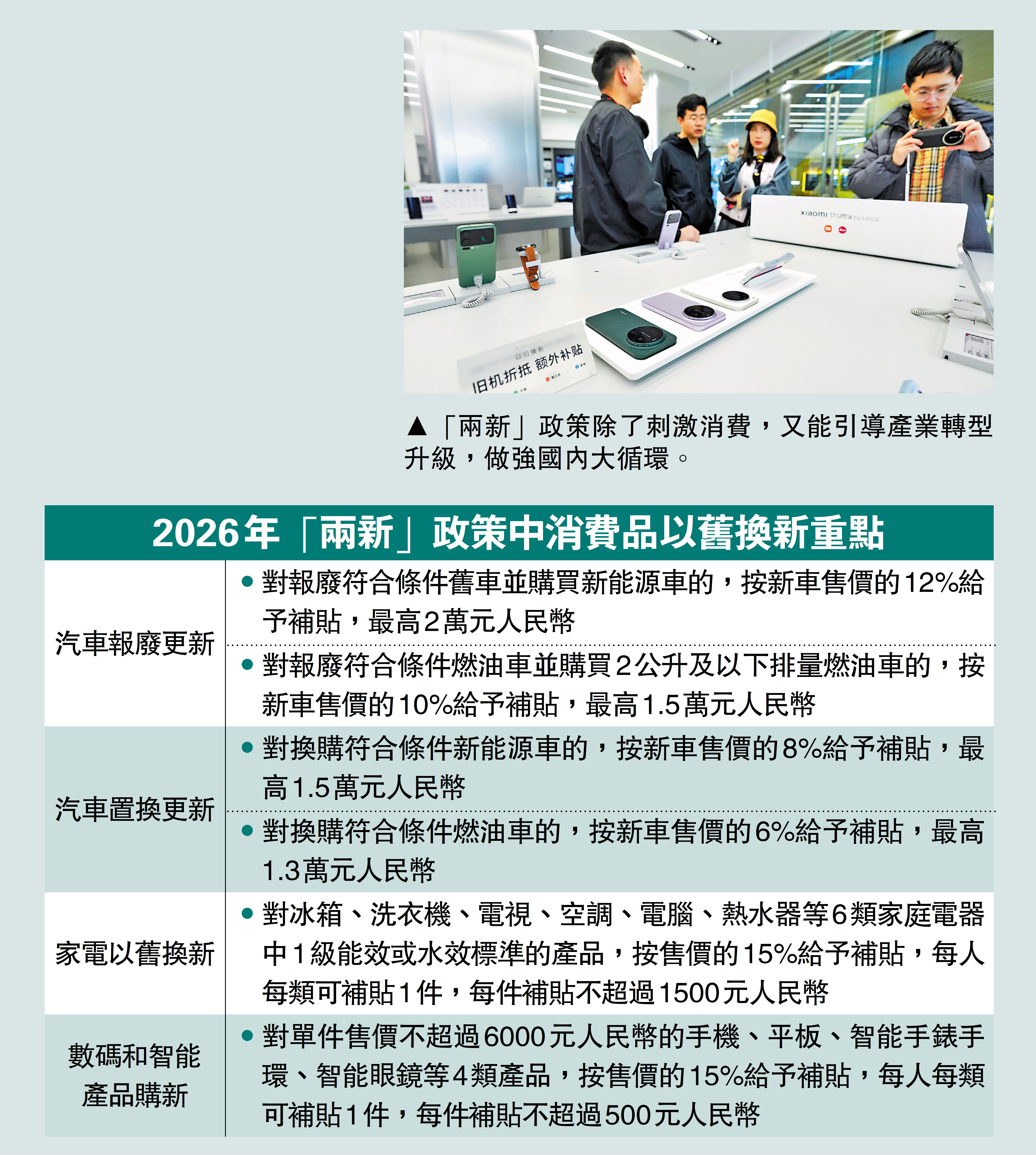 2024年2月,中央財經委員會第四次會議研究大規模設備更新和消費品以舊換新問題,並強調要鼓勵引導新一輪大規模設備更新和消費品以舊換新。隨後,當局三次出台並更新「兩新」政策的行動方案及相關措施,以超長期特別國債作為補貼政策資金來源。是次2026年的政策更新,除了從「定額制」改用「比例制」補貼汽車報廢及置換更新,還將智能眼鏡納入補貼;雖然取消家裝消費品補貼,但仍支持智能家居產品(包括適老化家居產品)購新補貼,且補貼標準由地方制定。