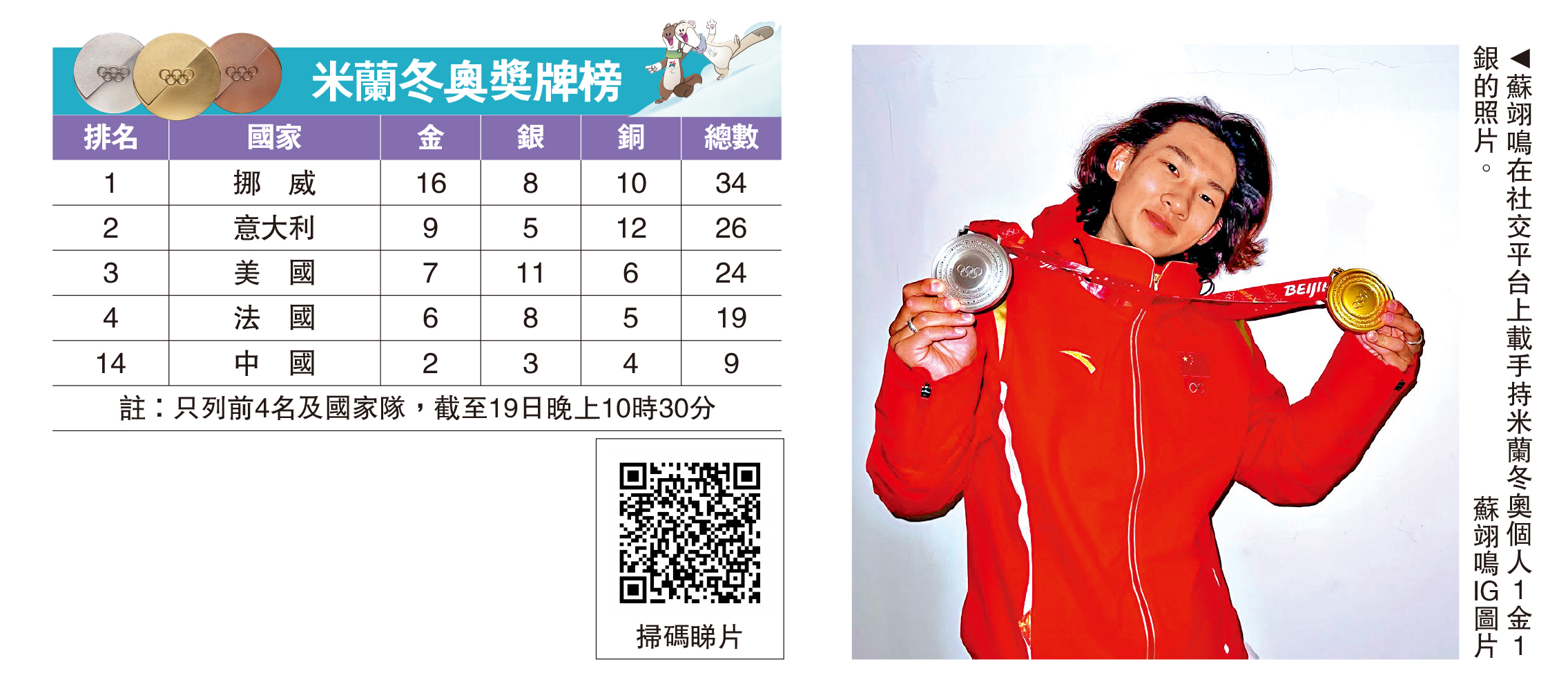【大公報訊】綜合新華社報道:18日為中國代表團奪得米蘭冬奧會首金後的新聞發布會上,蘇翊鳴數次看向手機─他正關注着不遠處空中技巧場地上的比賽,「大姐姐」徐夢桃實現了冬奧衛冕!