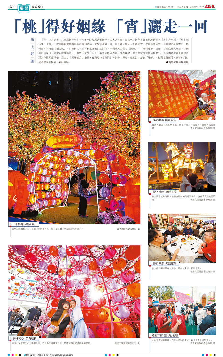「年……又過年,共慶歡樂年年」,今年一匹駿馬翩然而至,人人逛年宵、派紅包、辦年貨都如馬般迅速。「馬」力全開、「馬」到功成、「馬」上有錢等祝賀語遍布香港每個角落。玄學家最懂「馬」中含意:屬火、象徵南方,求姻緣的朋友,只要擇個良辰吉日,向特定方向行走「納吉氣」,再買桃花一棵,桃花運就火速前來。宋代詩人王安石《元日》:「爆竹聲中一歲除,春風送暖入屠蘇。千門萬戶曈曈日,總把新桃換舊符。」當中所言的「符」,其實大概與春聯、揮春無異,除了方便快捷的印刷體外,不少團體都請來書法老師為市民即席揮毫,寫出了「天增歲月人增壽,春滿乾坤福滿門」等對聯、揮春。至於詩中所云「屠蘇」,則是指屠蘇酒,過年也可以到酒樓以茶代酒,樂也融融。●香港文匯報編輯組