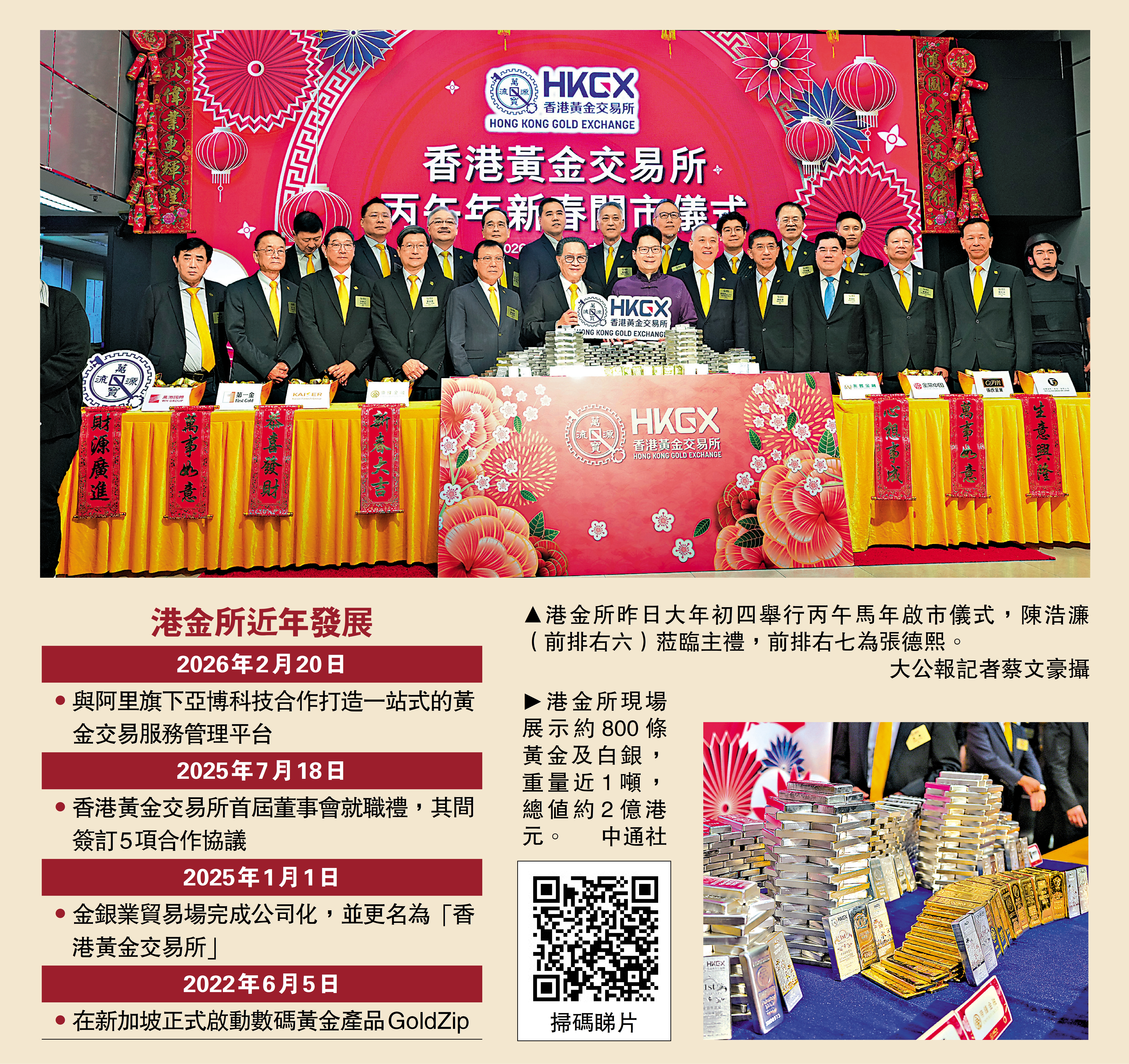 另外,港金所昨日宣布,為配合特區政府的國際黃金交易中心政策,亦為增強與國際黃金產業的貿易、交易及物流的聯繫,港金所與亞博科技合作開發國際貴金屬交易平台。
