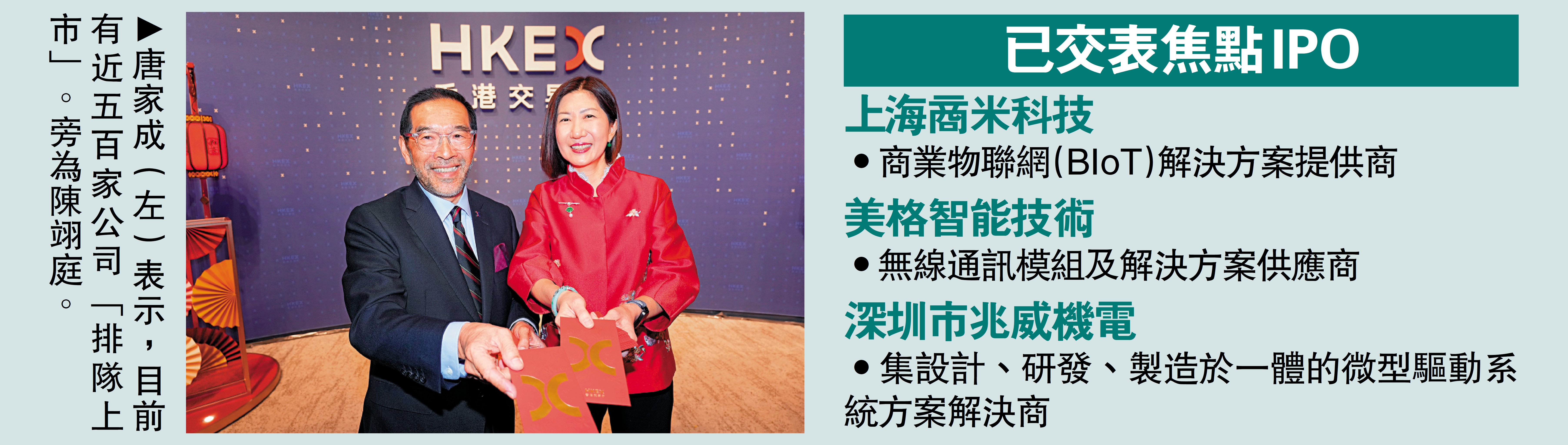 陳翊庭昨在開市儀式後表示,現時排隊上市的企業中,逾10間是國際公司,亦不乏新能源、人工智能(AI)、生物科技等公司。雖然來港上市的公司以中資企業居多,但很多屬國際級企業,不少逾一半收入來自全球各地。唐家成表示,現在內地企業在高科技實力已很強,完全和美國看齊,故很多內地的AI、機器人及藥物公司均為最受歡迎的上市公司。
