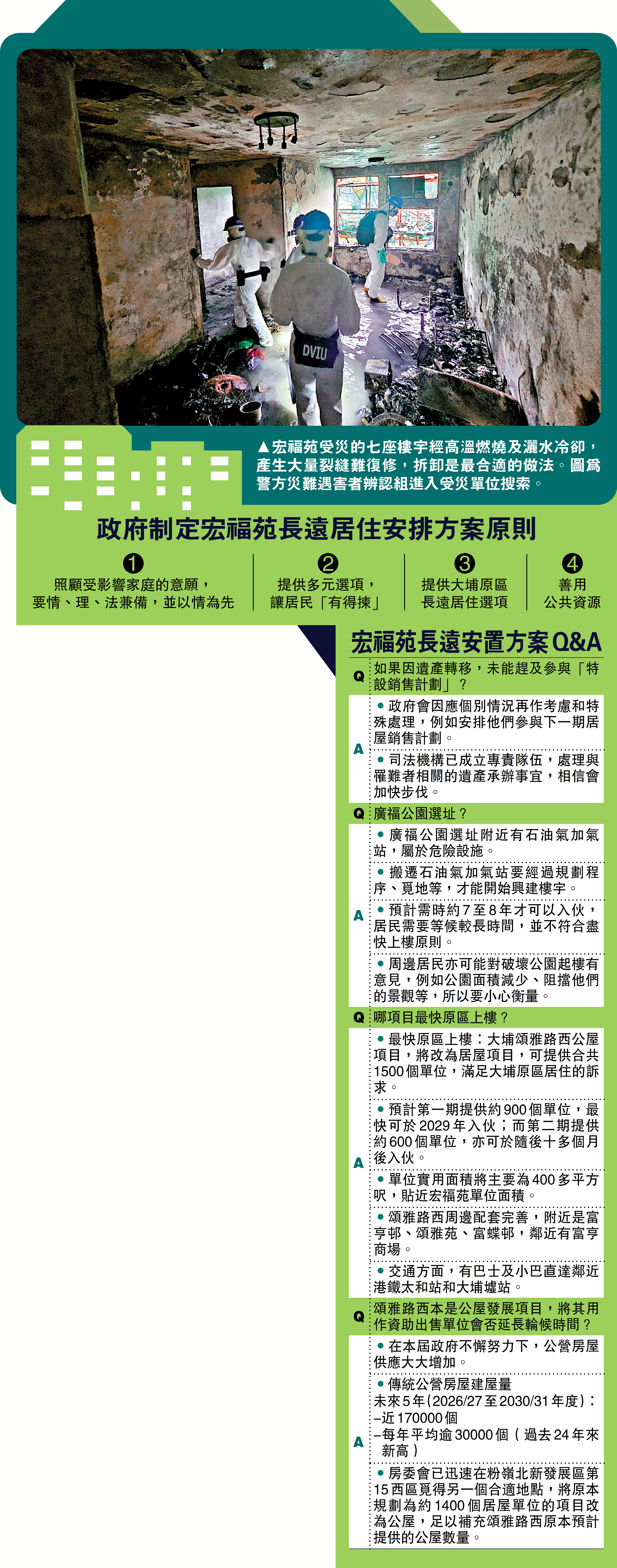 特區政府昨日公布大埔宏福苑長遠居住安排方案時表示,七座大廈的石屎受到長時間高溫大火加熱,再因滅火灌救快速冷卻,熱脹冷縮令石屎結構內產生大量微裂縫,造成不可逆轉的嚴重「內傷」,大廈雖無即時倒塌危險,但長遠會有石屎剝落、鋼筋脫落情況,不宜居住,經評估認為難有合乎成本效益的復修方法,最終需要拆卸。