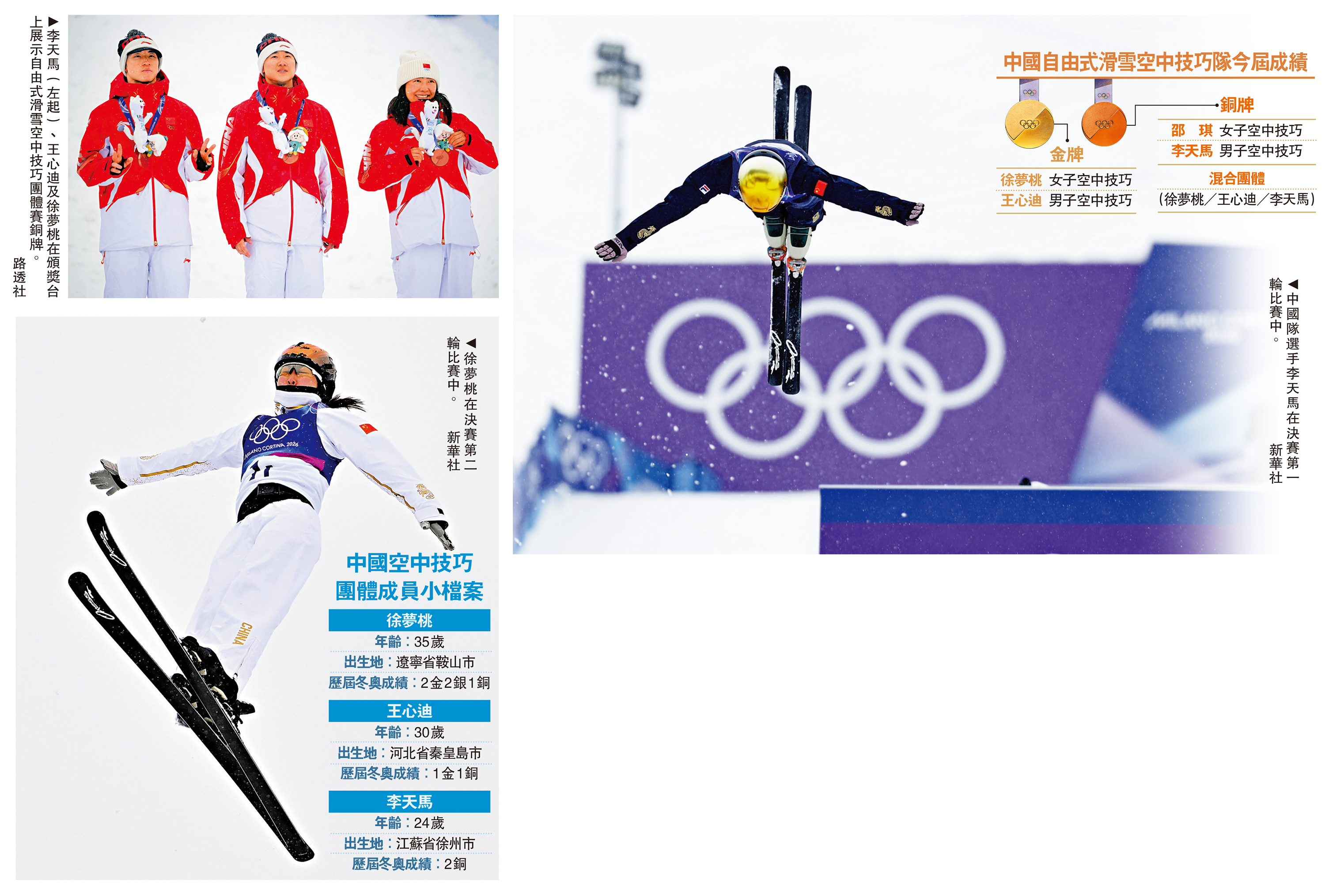 米蘭冬奧會21日在意大利利維尼奧舉行自由式滑雪空中技巧混合團體賽事,由徐夢桃、王心迪、李天馬三人組成的中國國家隊,晉級最後4隊出戰的決賽第二輪競逐獎牌,最終以總分279.68分獲得一枚銅牌。中國自由式滑雪空中技巧隊於今屆冬奧會完成所有賽事,雖然混合團體賽未能突破上屆北京冬奧銀牌成績,但隊伍在今屆總共贏得2金3銅,仍創出單屆賽會空中技巧項目的最佳成績。\大公報記者 梁潤森