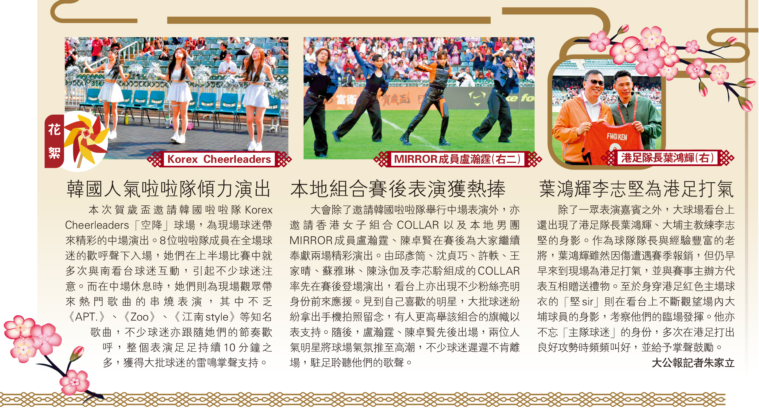 本次賀歲盃邀請韓國啦啦隊Korex Cheerleaders「空降」球場,為現場球迷帶來精彩的中場演出。8位啦啦隊成員在全場球迷的歡呼聲下入場,她們在上半場比賽中就多次與南看台球迷互動,引起不少球迷注意。而在中場休息時,她們則為現場觀眾帶來熱門歌曲的串燒表演,其中不乏《APT.》、《Zoo》、《江南style》等知名歌曲,不少球迷亦跟隨她們的節奏歡呼,整個表演足足持續10分鐘之多,獲得大批球迷的雷鳴掌聲支持。