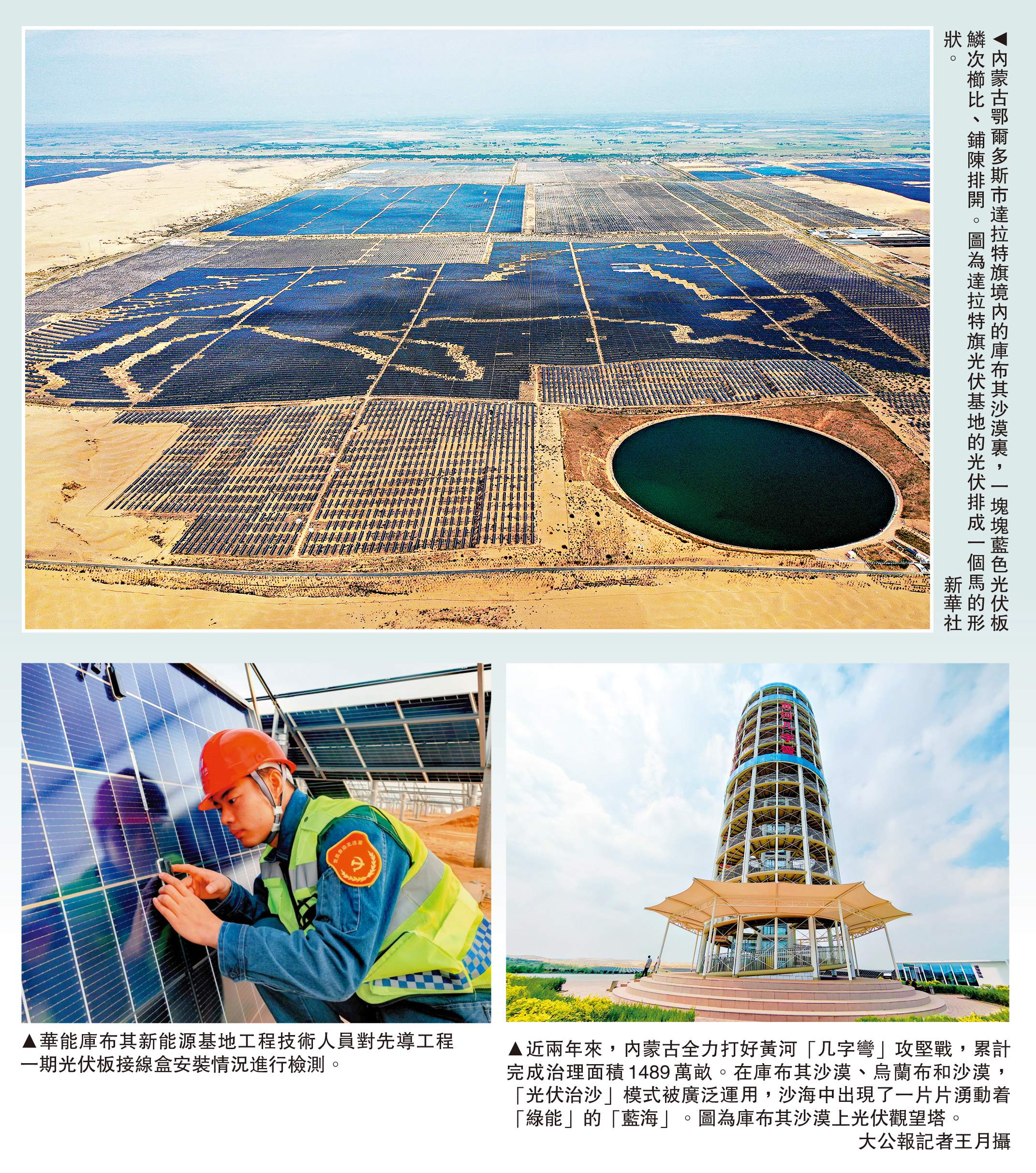 黃河「几字彎」南岸,中國第七大沙漠庫布其之上,千萬塊光伏板如藍色星河綿延鋪展,將昔日黃沙漫天的荒漠,打造成源源不斷輸出清潔電力的「綠色能源寶庫」。2026年內蒙古自治區、鄂爾多斯市兩級政府工作報告均明確聚焦現代能源經濟發展,部署新能源產業升級任務,庫布其沙漠光伏項目,以規模化布局、科技化賦能、多元化共贏的亮眼成效,書寫出沙漠變綠洲、綠電助發展的佳話,實現治沙發電富民三贏。\大公報記者 喬輝、王月