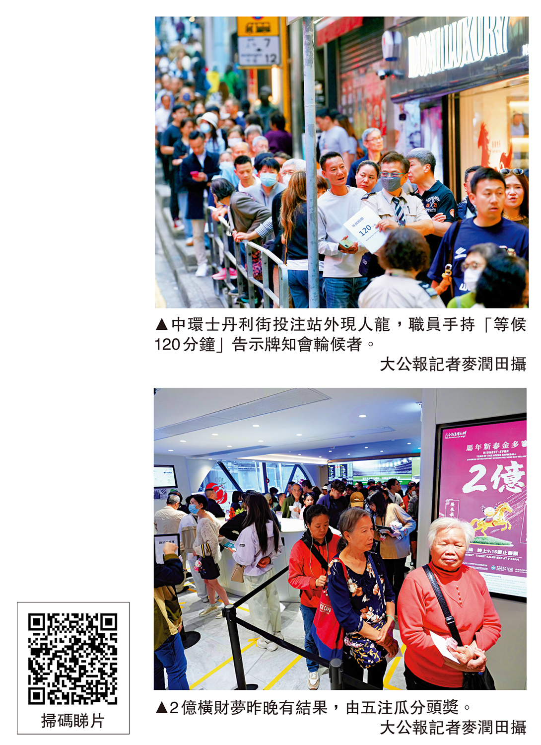 【大公報訊】記者卓彤報道:史上最高、一注獨中可得2億的新春金多寶昨晚攪珠,吸引大批市民投注。歷來中獎率最高的中環士丹利街投注站昨日未開門已大排長龍,一度有約千人排隊,人龍延伸至威靈頓街與擺花街交界,場面墟冚。高峰期需排隊約兩、三個小時才能買到彩票,不少人從其他區專程前來沾旺氣,亦有內地旅客特地來港碰運氣。攪珠結果頭獎5注中,每注獎金逾4200萬元。