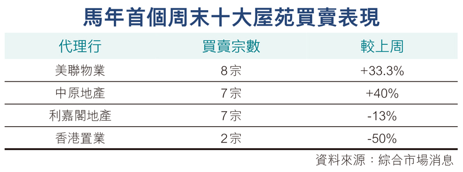中原地產十大屋苑本周末錄得7宗成交,終止2周跌勢,較上周回升四成,當中零成交屋苑維持5個。中原地產亞太區副主席兼住宅部總裁陳永傑表示,農曆新年假期後緊接的周末,樓市交投普遍例靜。然而,今年卻截然不同,馬年首個周末,中原十大屋苑即錄得7宗成交,雖是個位數成交量,但明顯不算淡靜,可見市場購買力已起動,樓市將迅速復常,延續「小陽春」的旺勢。
