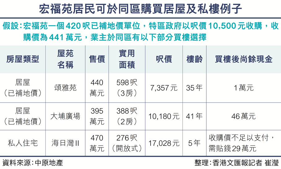 香港文匯報訊(記者 李芷珊)根據香港特區政府的收購業權方案,宏福苑未補地價單位的收購價為每平方呎8,000元,已補地價單位則為每平方呎10,500元。倘若業主選擇接受現金收購方案,其中一個選項為利用現金自行作長遠居住安排。香港文匯報記者昨日翻查大埔區的樓盤資料,單是中原地產網已有逾50個二手居屋單位放售,主要來自大埔廣場、頌雅苑、怡雅苑及新興花園等屋苑,絕大部分單位售價均低於政府提出的宏福苑收購價,部分樓宇樓齡較低,更不乏置業後仍「有錢剩」的情況。