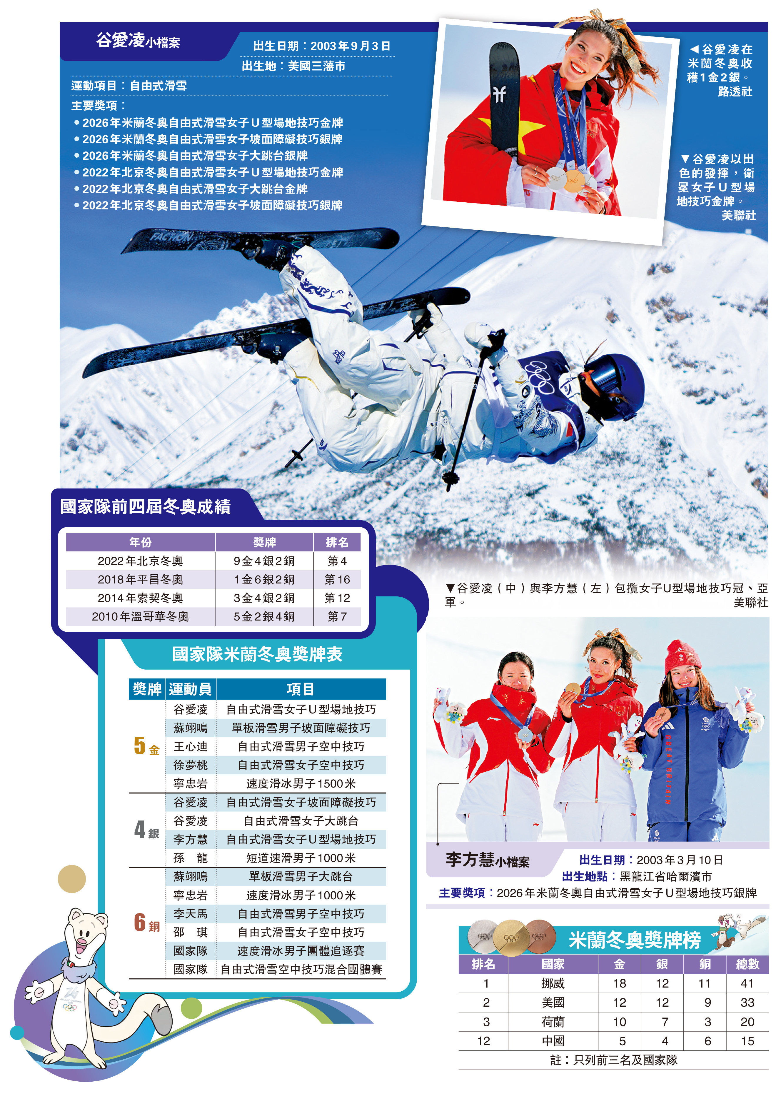隨着谷愛凌、李方慧22日包攬米蘭冬奧會自由式滑雪女子U型場地技巧冠、亞軍,中國代表團在本屆冬奧上已獲得5金4銀6銅,刷新冬奧境外參賽歷史最好成績。中國冬奧軍團此前的境外參賽歷史最好成績是2010年溫哥華冬奧的5金2銀4銅。