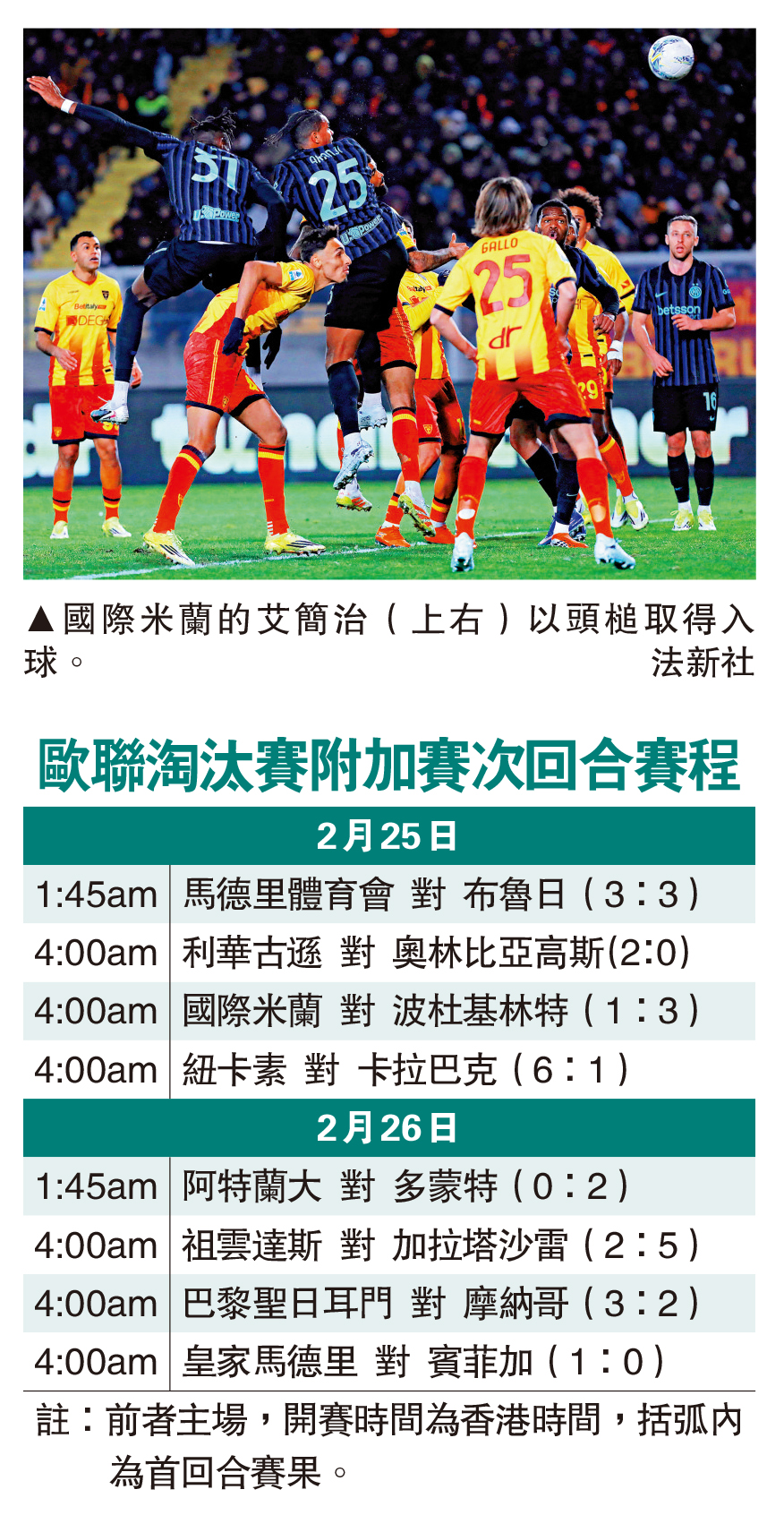 【大公報訊】同樣未能在歐聯淘汰賽附加賽首回合取得領先優勢的意甲國際米蘭與西甲馬德里體育會,分別於22日凌晨上演的聯賽奏捷,望能為次回合獲勝晉級一振士氣。