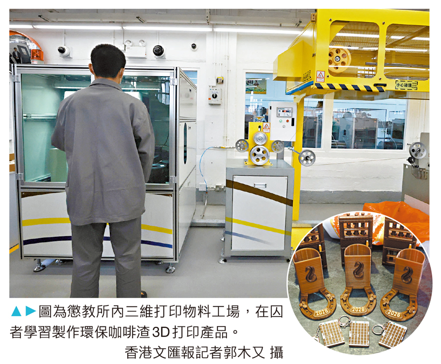 懲教署去年亦全方位加強更生工作,以協助在囚者改過自新,重投社會後成為建設的力量,包括舉辦愛國電影放映會及徵文比賽,加深在囚者對國家文化歷史、發展與變遷的了解,以及引入「咖啡渣轉化為3D打印物料」技術,生產多款以咖啡渣升級物料為材料的限定產品,讓在囚者學習到更多新技能、新產業知識。