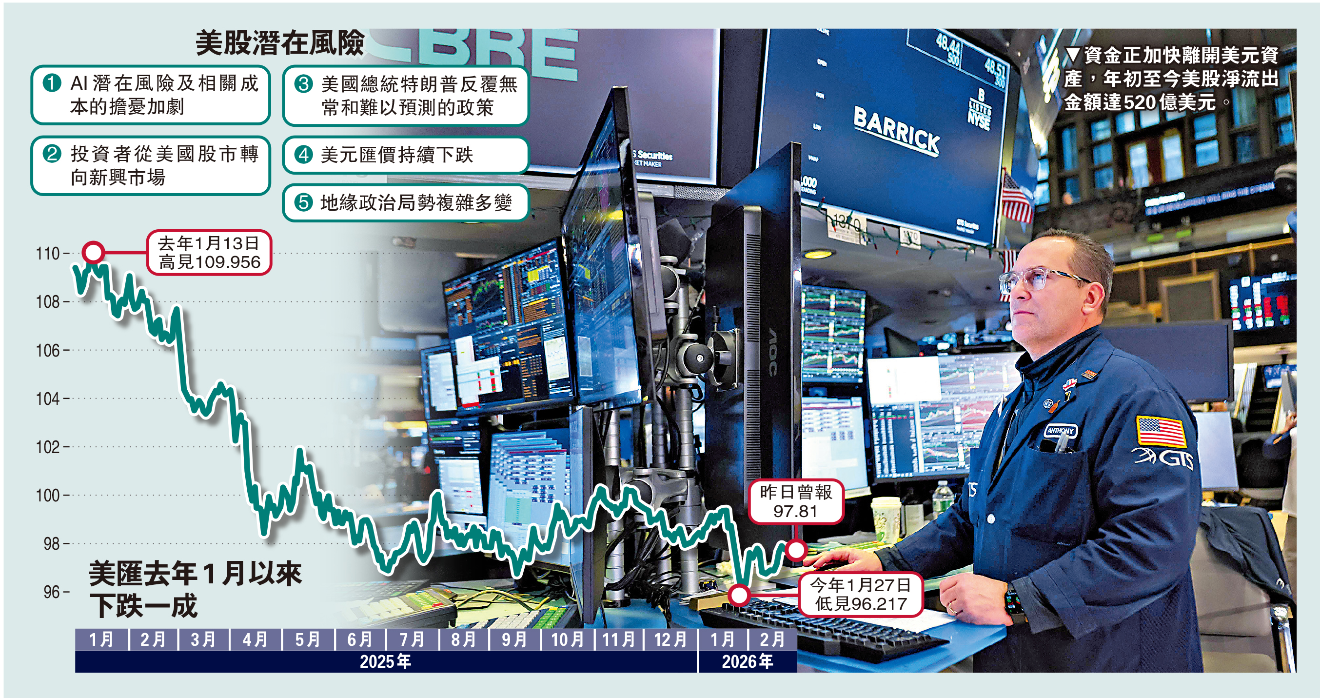 由於美國總統特朗普的政策充滿不穩定性,加上投資市場憂慮AI股泡沫風險,資金正以前所未有的速度流出美元資產,並加速配置海外資產。根據統計,過去六個月,美國本土投資者從美國股票產品撤出約750億美元(約5863億港元)的資金,單計今年首八周,流出金額約520億美元(約4056億港元),為2010年以來「年初前八周」同期最大撤資規模。