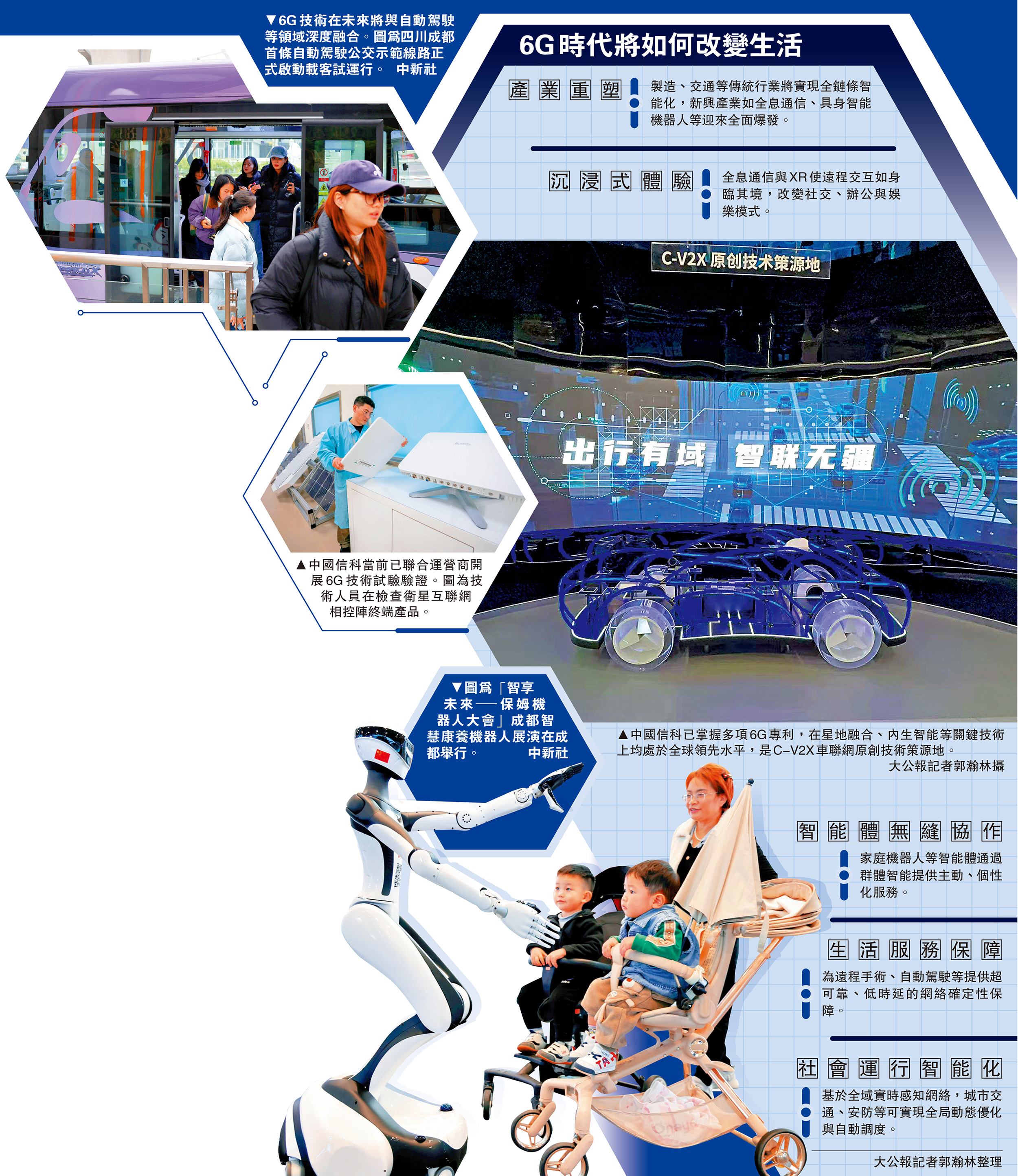 「5G時代,網絡信號在偏遠地區的覆蓋仍然有限。而6G時代的目標之一,正是打破這種邊界,通過融合高中低軌衛星與地面移動網絡,將覆蓋從地面延伸至近地空間,實現空天地海全覆蓋。未來,手機直連衛星都將有望像地面通信一樣穩定可及。」中國信息通信科技集團(簡稱「中國信科」)工作人員介紹,經過在6G領域的多年布局,中國信科已掌握多項6G專利,在星地融合、內生智能等關鍵技術上均處於全球領先水平。企業負責人向大公報記者表示,6G技術在未來將實現「全域覆蓋」與「萬物智聯」,並與自動駕駛、具身智能、商業航天等領域深度融合,全面賦能千行百業與民生福祉。\大公報記者 郭瀚林北京報道