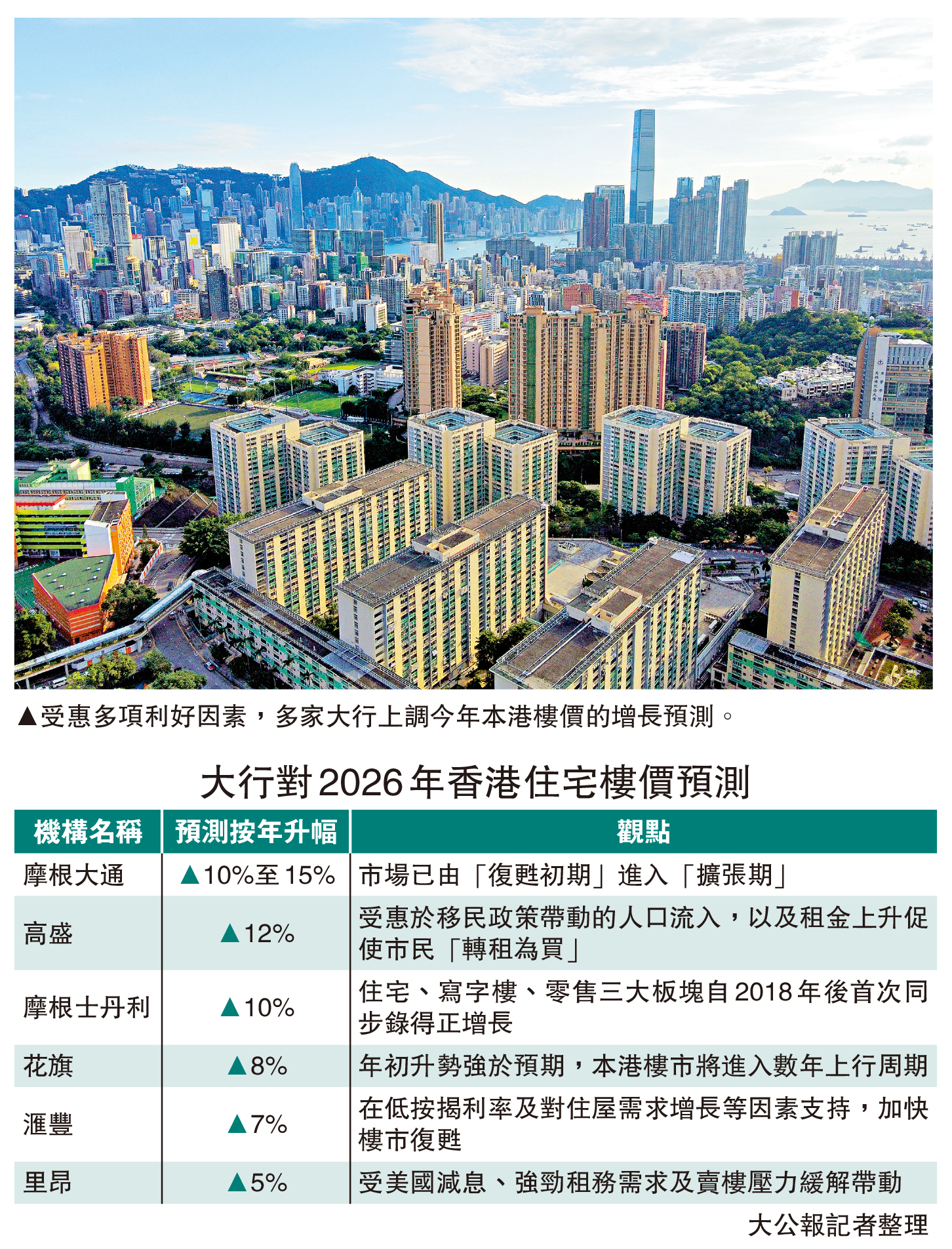 香港樓市氣勢如虹,多家大行相繼加入唱好行列。其中,摩根大通發表報告,大幅調高2026年香港住宅樓價升幅預測,由原來的5%至7%,上調到10%至15%。此外,該行明確指出本港樓市已告別調整期,正式進入新一輪上行周期,明年樓價料再升約5%。\大公報記者 邵淑芬