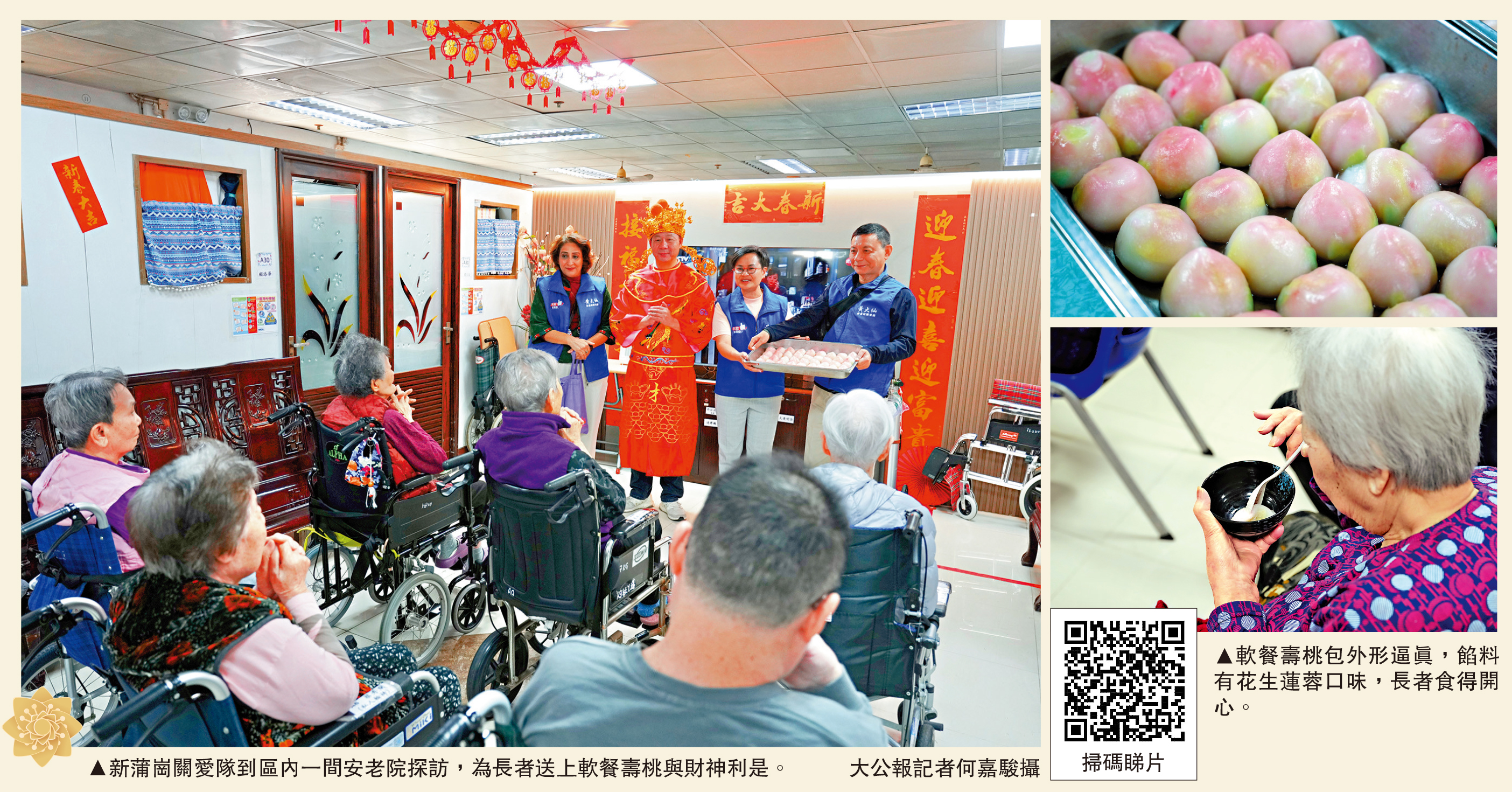 昨日是農曆大年初七「人日」,新蒲崗關愛隊走入社區院舍向長者拜年,為「老友記」送上特製軟餐壽桃包,「有賣相、有口感、有味道」,共同感受佳節溫度。如此貼心的節日「送軟」並非是第一次,此前情人節、中秋節,關愛隊都第一時間想到為長者提高飲食質量。