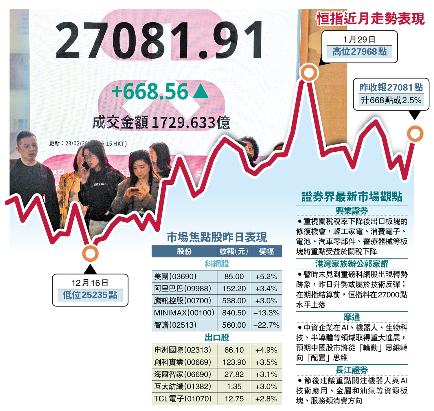 美國政府去年推出《國際緊急經濟權力法》遭美國最高法院裁定違法,雖然特朗普政府隨即依照第122條的加徵全球15%關稅,但中國對美國商品出口關稅稅率有5個百分點降幅。大摩認為,美國關稅的不確定性已經過去。受關稅消息提振,港股裂口高開,恒指全日升幅一度擴大至742點,收市升668點,報27081點。內地A股休市,北水尚未回歸,主板成交額輕微增加75億至1729億元。