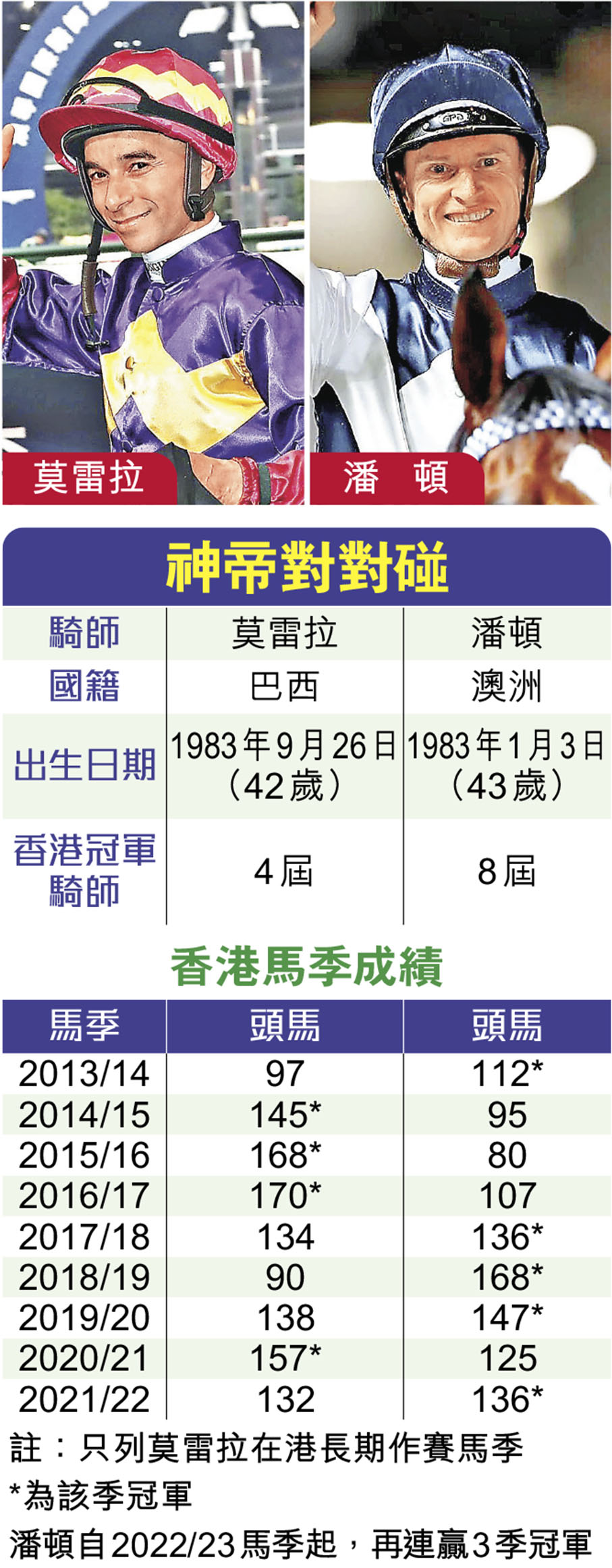 曾經13度贏得香港冠軍騎師寶座的韋達,受到莫雷拉加入的衝擊,以及潘頓崛起,自2013/14馬季起跌落神壇,而由該季起至今的12季,「雷神」贏得當中4季,「潘帝」則成了八屆王者。當然,在這場「神帝激鬥」之中,「雷神」雖然冠軍較少,卻絕不能說成是敗方,皆因他在2022/23馬季因傷宣布告別香港馬壇,之後他選擇到世界各地客串作賽,間中也會趁國際大賽回港參戰,包括今季也在港拿下了5場頭馬。