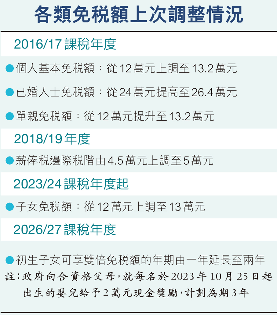 香港文匯報翻查資料發現,本港多個稅項已多年未有調整,其中個人基本免稅額及已婚人士免稅額更已近十年維持不變,不少團體及議員均呼籲特區政府上調部分免稅額,以減輕納稅人負擔。