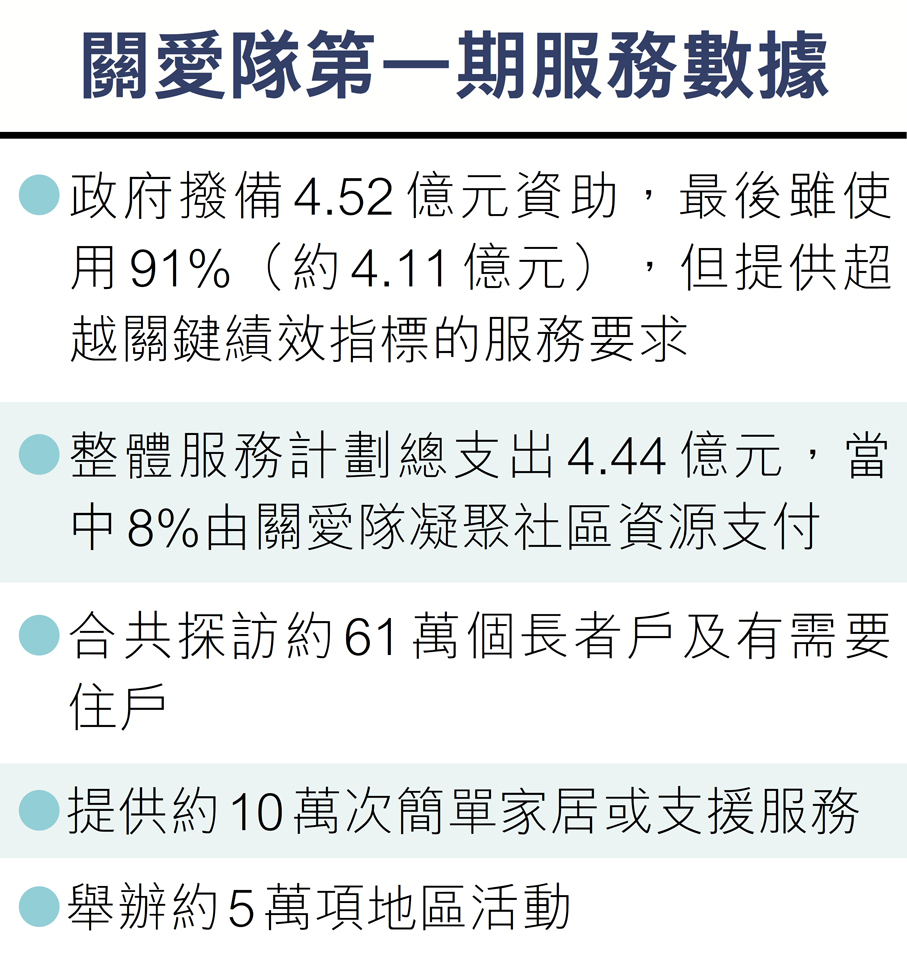 首期關愛隊服務全部達標完成 部分超越關鍵績效指標要求 政府4.52億資助僅使用91%