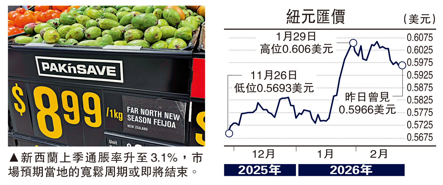 另外,新西蘭去年第四季通脹率意外升至3.1%,市場預期和前值都為3%,按季亦升0.6%。經濟復甦使物價回暖,現時已超出新西蘭央行1%至3%的通脹目標,當地統計局稱雖然新西蘭通脹比高峰時已大幅放緩,但自2024年第四季度以來,每季通脹都較之前數據有明顯回升,市場揣測當地央行的寬鬆周期或即將結束。