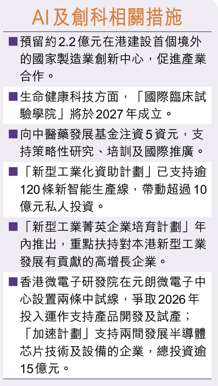 考慮到算力是支持AI發展重要基礎,陳茂波指沙嶺數據園區將進一步提升整體算力規模,項目可提供25萬平方米樓面面積,招標結果於短期內公布。為對接國家「人工智能+」行動,香港人工智能研發院將於下半年投入運作,並就相關發展的治理框架及規管制度等提供意見。另一方面,金融管理局與數碼港剛開展第二期沙盒測試,探索「以AI對抗AI」,推動銀行業更安全及負責任地應用AI。