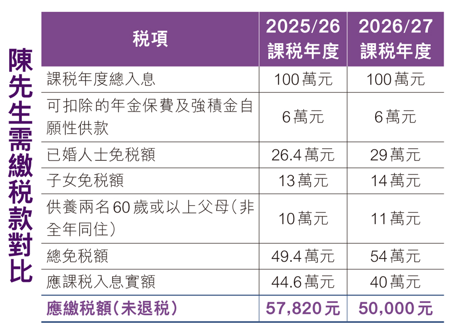 不過,新年度預算案建議的各項免稅額調整後,陳先生於2026/27課稅年度的總免稅額上調至54萬元,未計算退稅下應繳付50,000元稅款,稅款減少近8,000元(見表)。