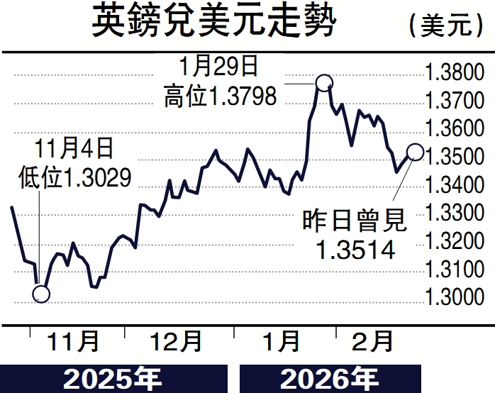 另外,美國最高法院裁定總統特朗普向多個國家徵收關稅的措施違法,然而,特朗普未有因此而改變他誓要向貿易夥伴加徵關稅的決定,更加因此而激發他引用另一條貿易法規,向全球額外加徵一成半關稅。特朗普繼續展示出他多變難測的政策,對美元應該會是構成壓力遠多於正面的推動,故此,英鎊亦有機會受惠弱美元而向上。