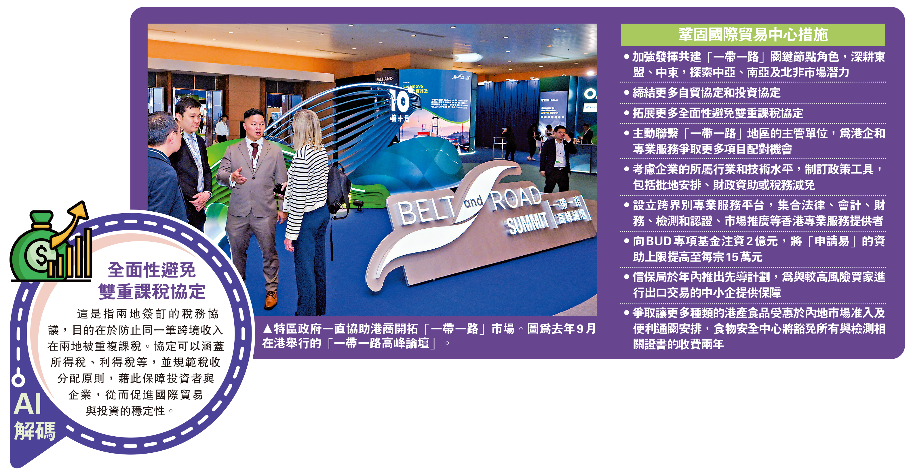 此外,陳茂波表示,面對複雜多變的地緣政經格局,香港會加強發揮共建「一帶一路」關鍵節點角色,聯同業界深耕東盟、中東市場,探索中亞、南亞及北非市場潛力。香港亦會締結更多自貿協定和投資協定,現時已分別與卡塔爾,孟加拉國和秘魯完成投資協定談判,並正與沙特阿拉伯和埃及探討新投資協定。同時,香港已簽訂55份全面性避免雙重課稅協定,包括去年與約旦、馬爾代夫、挪威和盧旺達的協定,將持續拓展協定網絡,工總指出,以上做法對港商開拓「一帶一路」及其他新興市場大有幫助。