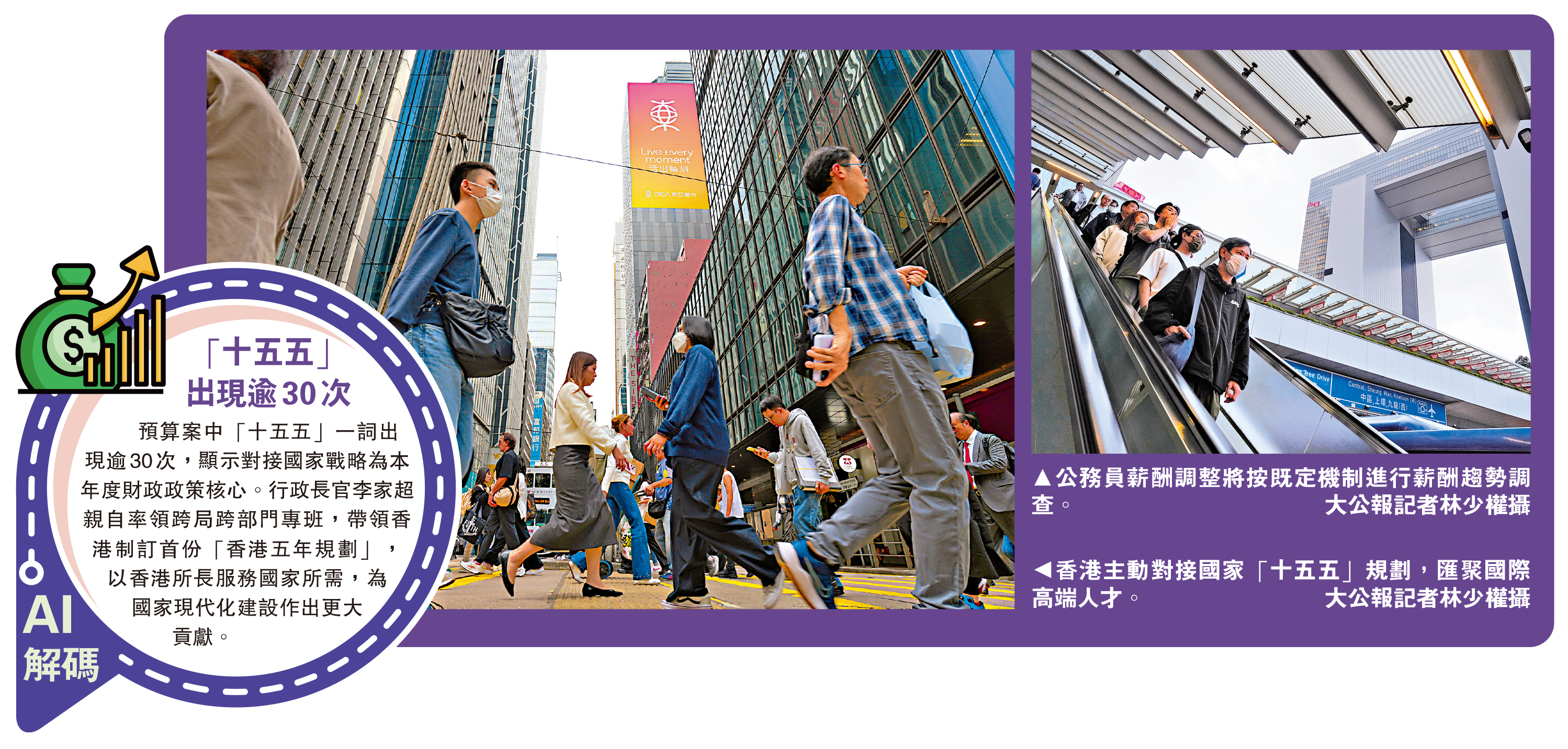 今年是「十五五」開局之年,陳茂波昨日在公布財政預算案時表示,行政長官將率領跨局跨部門專班,帶領香港主動對接國家「十五五」規劃,並首次制訂香港的五年規劃。香港會更積極融入和服務國家發展大局,以有為政府結合高效市場,推動經濟朝高質量、高增值、多元化方向前行。