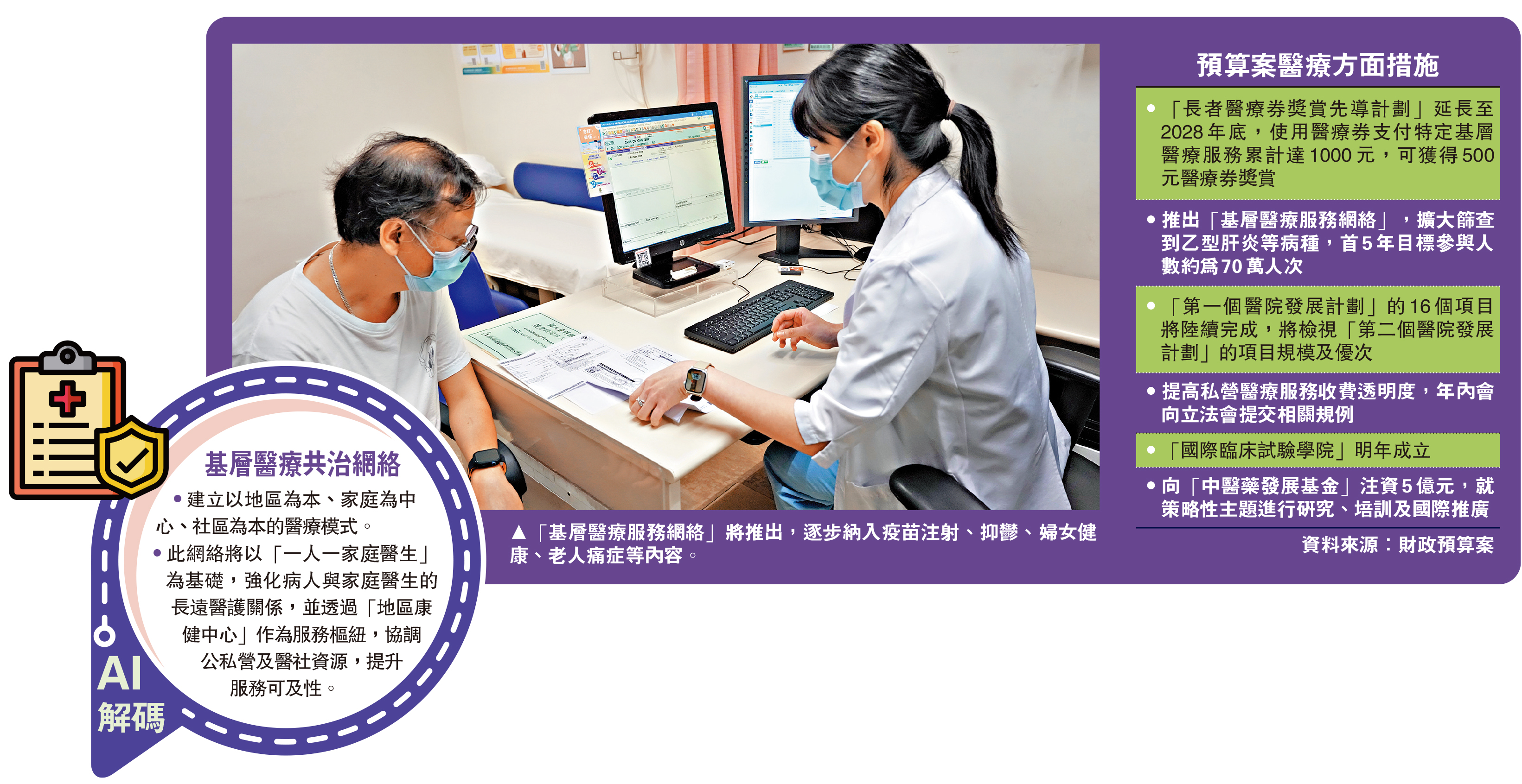 特區政府昨日發表的新一份財政預算案,提出優化醫療服務,將延長「長者醫療券獎賞先導計劃」至2028年底,且於短期內推出「基層醫療共同治理網絡」,逐步納入疫苗注射、抑鬱、婦女健康、老人痛症等內容。今年第四季度,政府還將推動社區藥物名冊和社區藥房計劃,方便市民。\大公報記者 黃佩琳