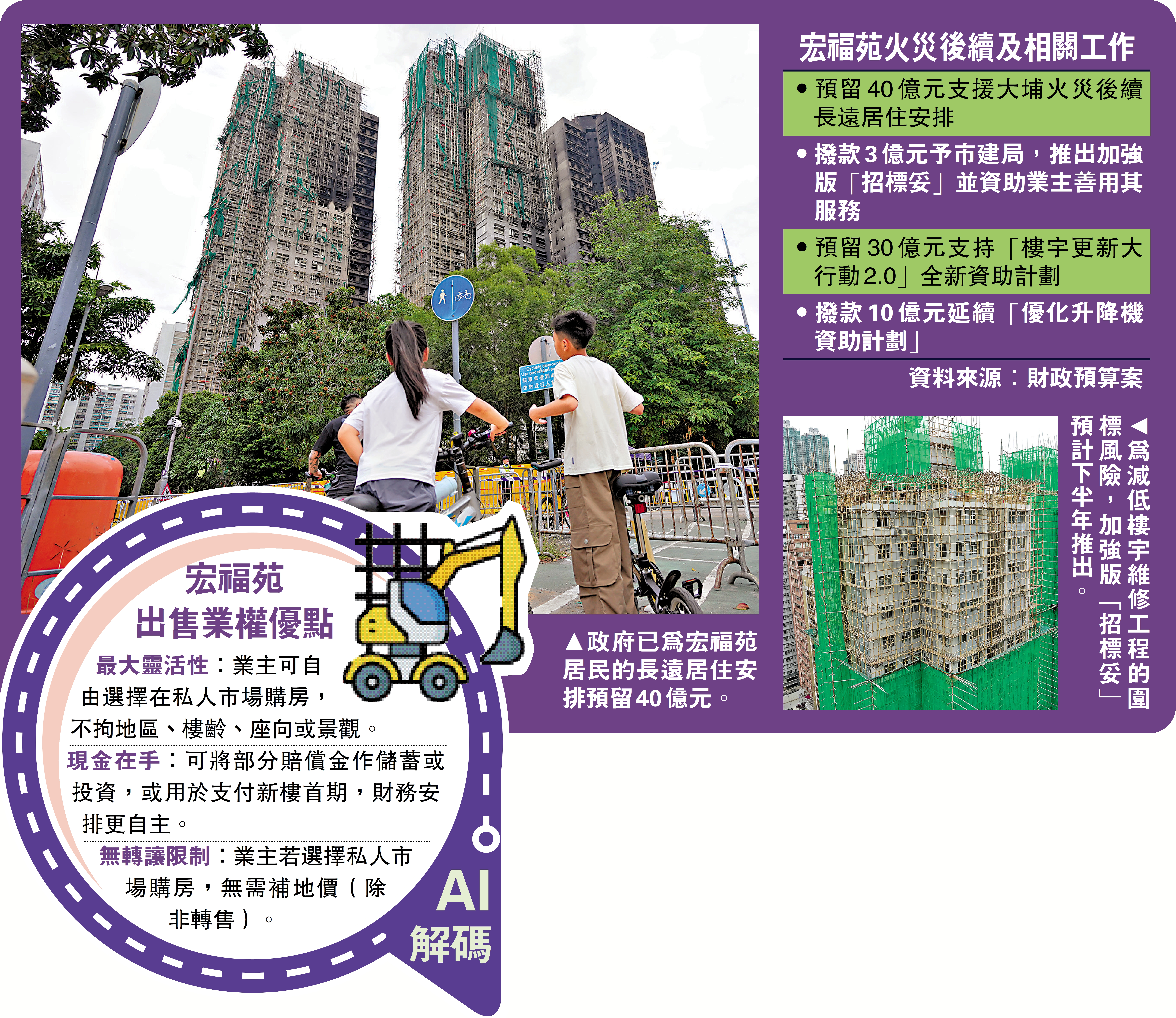 財政司司長陳茂波昨日在財政預算案公布,政府已預留40億元用於大埔宏福苑火災後續及相關工作,為受災人士提供全方位支援。預算案也提出向市區重建局撥款3億元,今年下半年推出加強版「招標妥」;另外預算30億元,在全面檢視「樓宇更新大行動2.0」後,明年制訂全新的資助計劃。