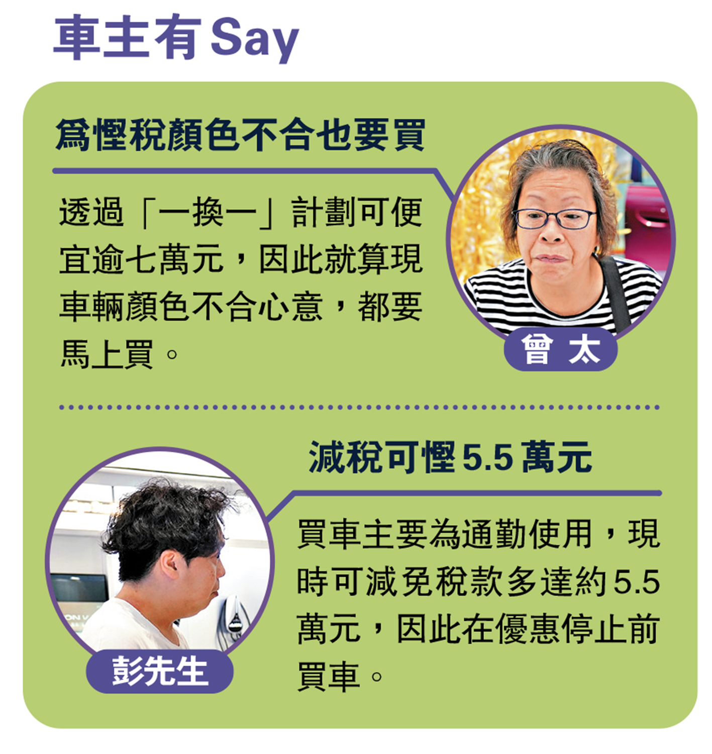 曾 太:透過「一換一」計劃可便宜逾七萬元,因此就算現車輛顏色不合心意,都要馬上買。