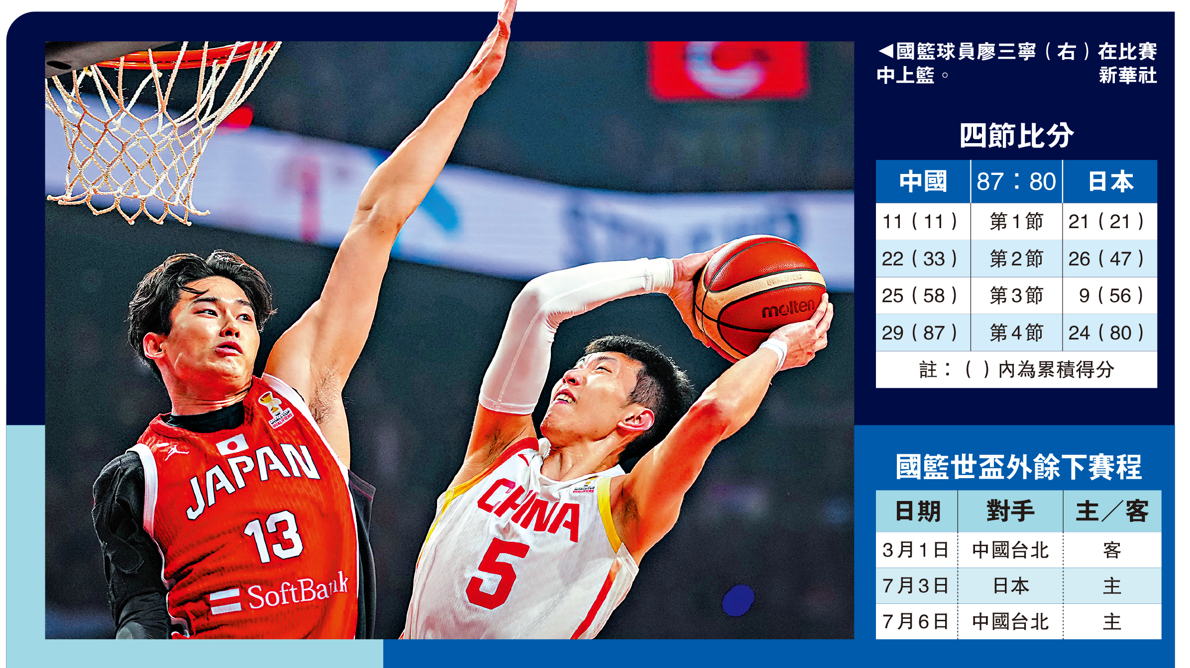 本次世盃外第一窗口期,國籃兩度不敵韓國隊,以0勝2負暫列小組末位。昨面對日本隊已是不容有失的關鍵之戰。此役,國籃主帥郭士強大膽調整首發,賀希寧、王浩然兩名年輕球員進入先發陣容。日本隊則棄用歸化內線核心霍金森,改用身高佔優但進攻手段相對單一的歸化球員科克。