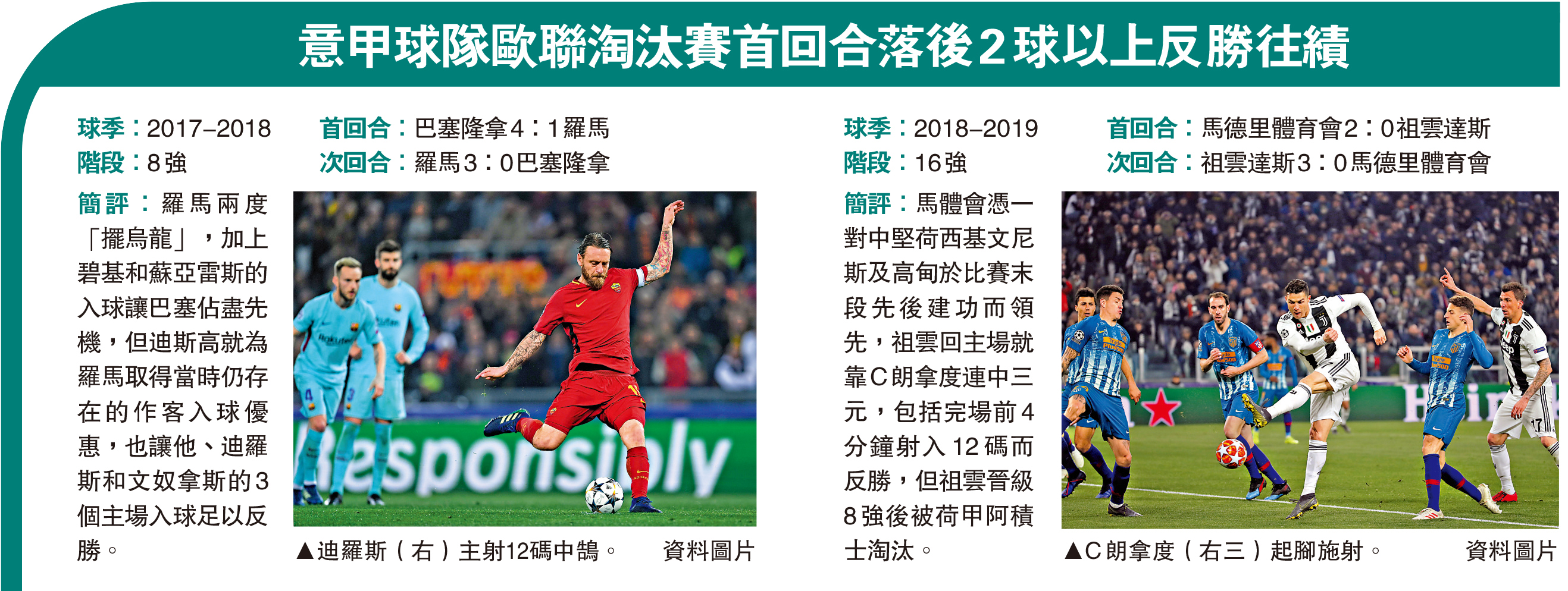 意甲球隊歐聯淘汰賽首回合落後2球以上反勝往績