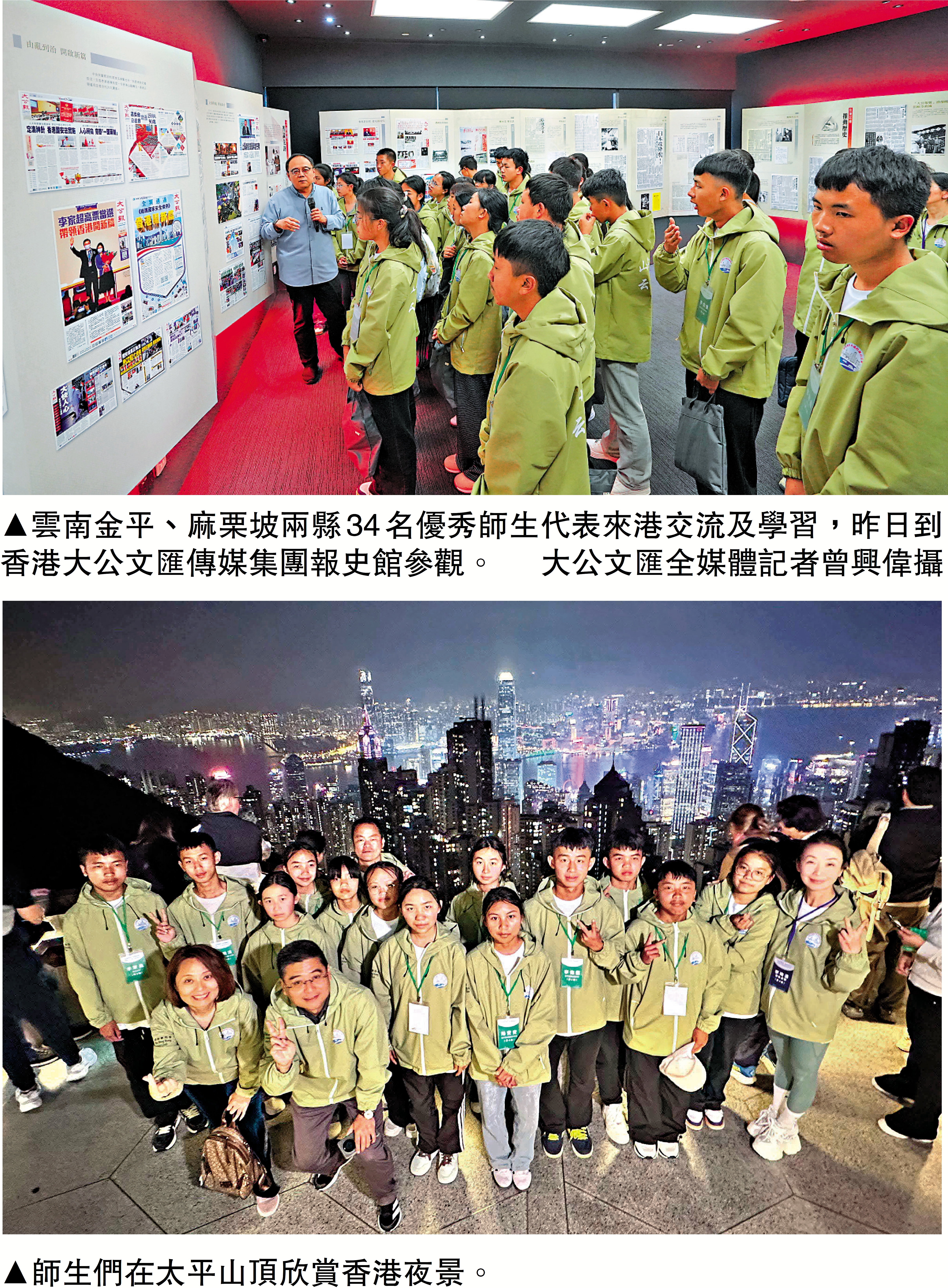 【大公報訊】為拓展學生的視野,外交部駐港特派員公署於2月23日至3月1日舉辦「山海相約 雲港同行」之雲南金平、麻栗坡師生赴港研學項目,邀請外交部定點幫扶的雲南金平、麻栗坡兩縣共34名優秀師生代表來港交流及學習,他們昨日獲安排到香港大公文匯傳媒集團報史館參觀,同學們欣喜表示,此行收穫滿滿,對百年媒體的愛國情懷與歷史擔當有了深刻認知。