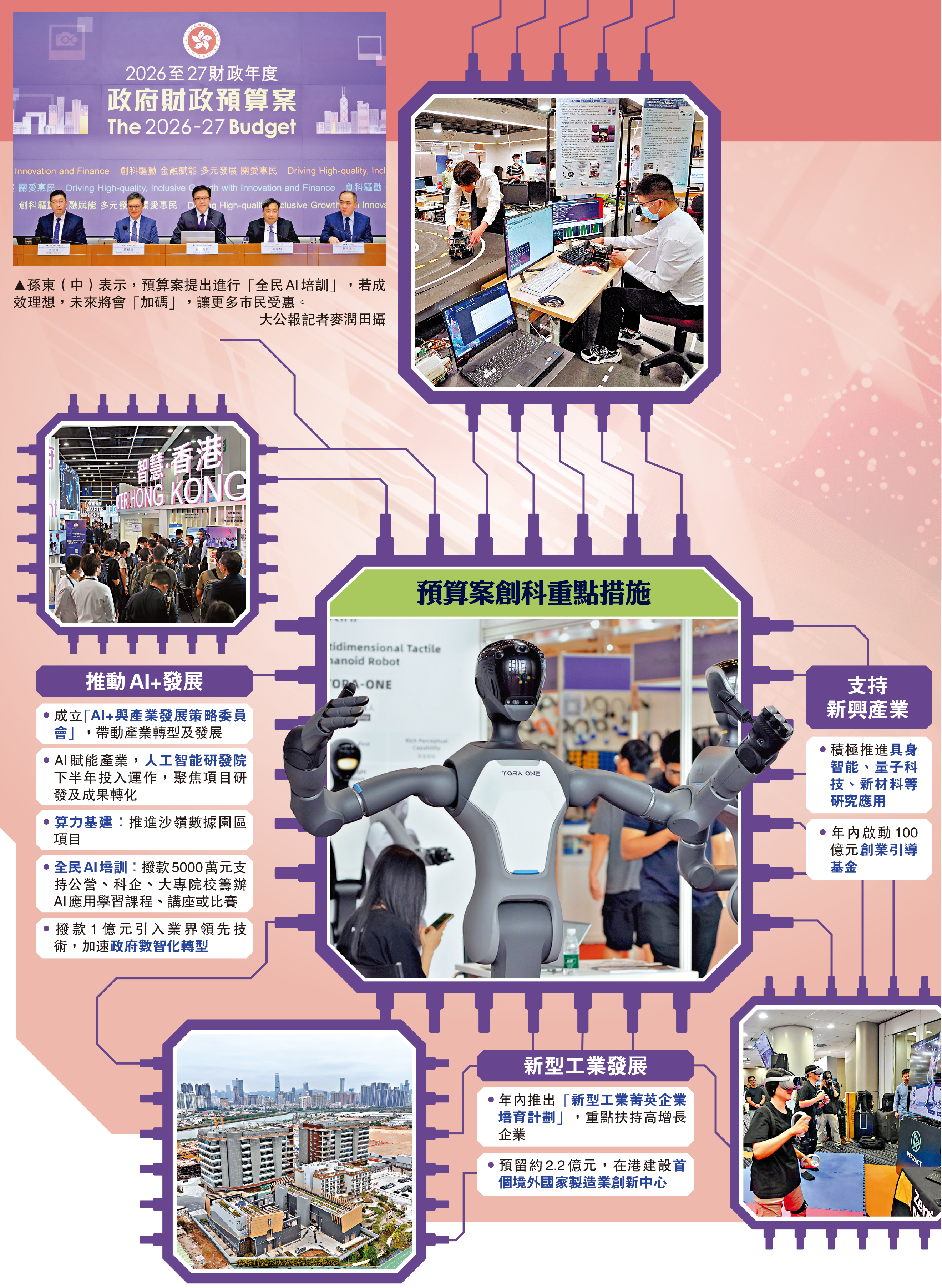 新一份財政預算案日前出爐,聚焦推動人工智能(AI)產業化、成立「AI+與產業發展策略委員會」及推行「全民AI培訓」等。創新科技及工業局局長孫東昨日舉行記者會闡述預算案相關措施。孫東表示,政府過去幾年努力在算力基礎、人才儲備、科研開發、國際數據庫建設及企業集聚等方面打下堅實基礎。現階段的重點是推動全民教育,讓廣大市民能夠抓住人工智能帶來的機遇。