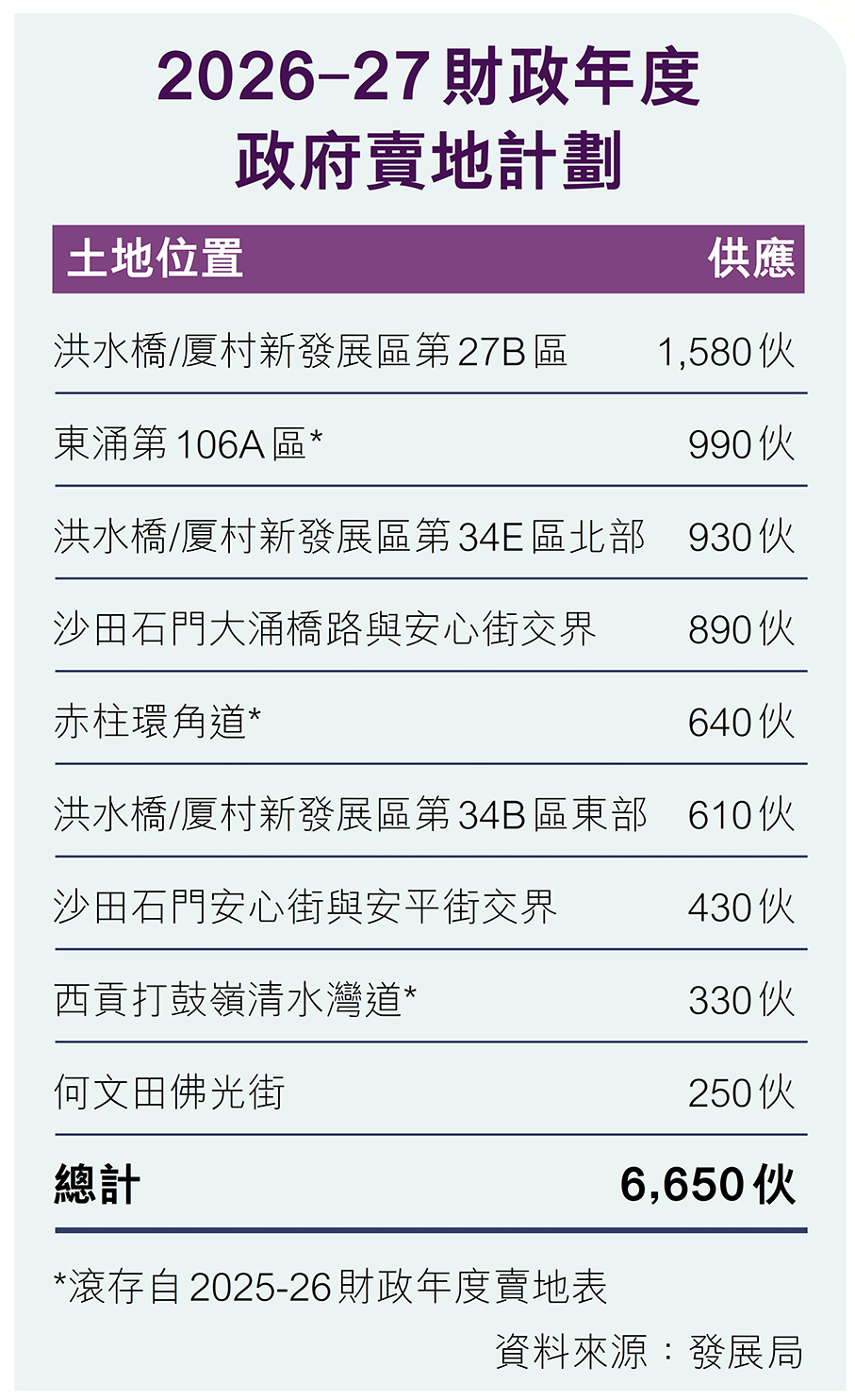 去年香港樓市終結3年下跌頹勢,差估署住宅樓價指數全年升3.25%,近日不少調查更預測今年樓市會有10%至15%的升幅。特區政府在新財年乘勢增加供應,首財季(2026年4月至6月)官地及「一鐵一局」等來源,將推出6,675伙。發展局局長甯漢豪昨表示,新財年賣地表共9幅住宅地,提供6,650伙,連同「一鐵一局」及私人項目,共可提供2.25萬伙,按年增加六成,是近八個財政年度新高。新財年供應超過過往的年度目標,她強調政府不會再靠高地價收入來搞基建,會多預留供應向市場顯示政府有足夠土地,並審時度勢推出,適時運用手上土地以穩定供應。 ●香港文匯報記者 黎梓田