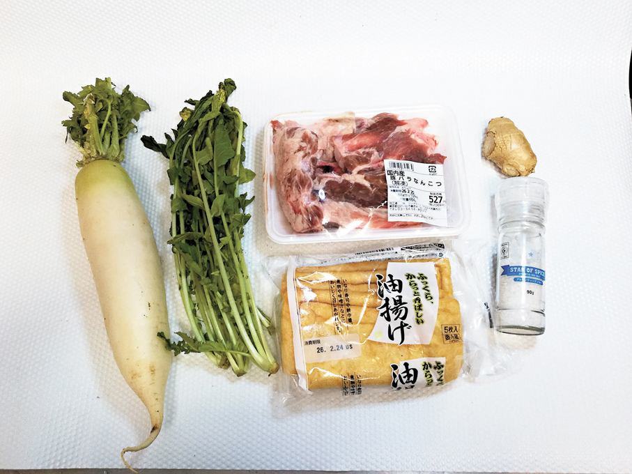 蘿蔔200克、豬軟骨400克、油揚50克、薑片20克、蘿蔔纓10克