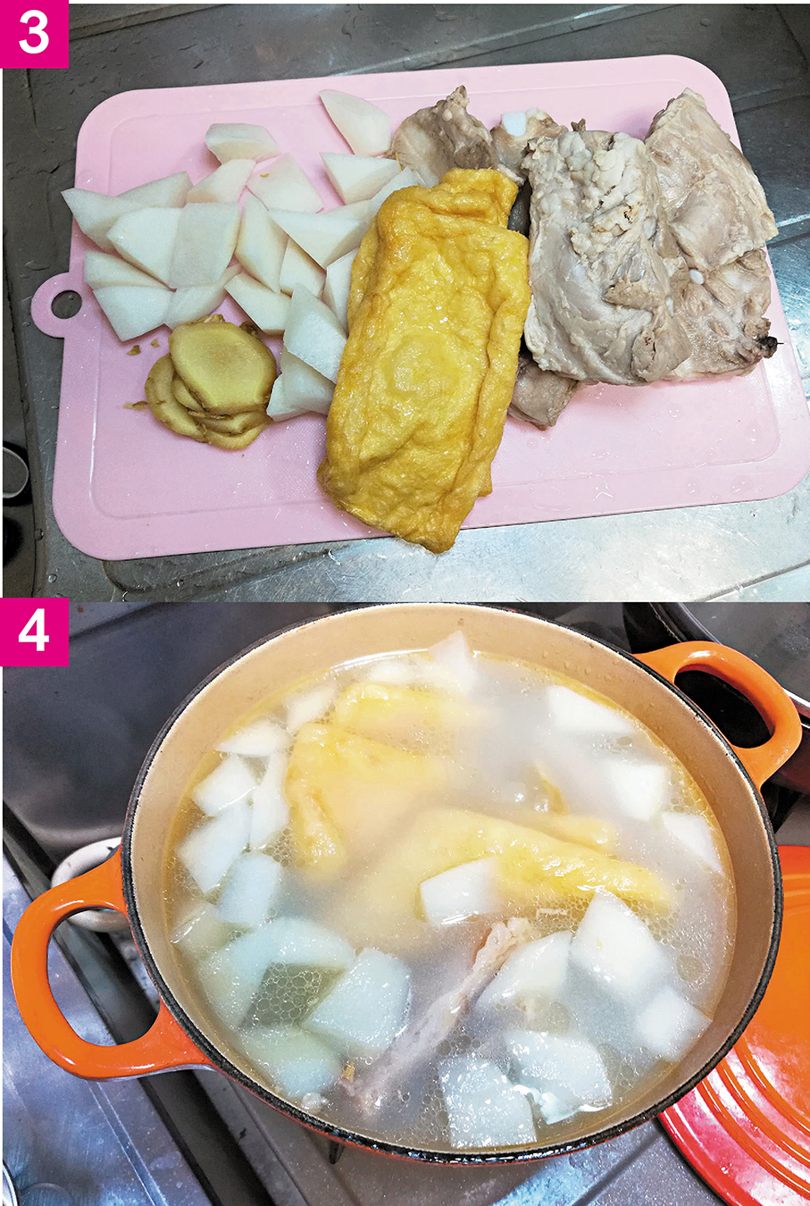 4. 大鍋內注水2公升、燒至沸騰後加入備用豬軟骨、蘿蔔、油揚及薑片,大火燒至再沸騰後蓋上鍋蓋轉小火煲90分鐘,下鹽調味,灑上蘿蔔纓即成。