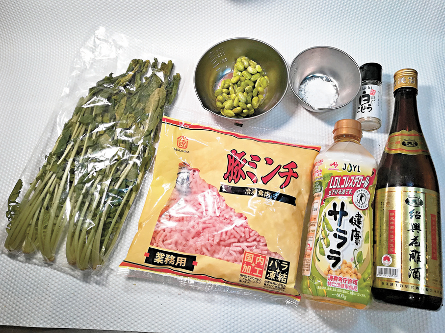 蘿蔔纓300克、鹽20克、碎豬肉400克、冷凍毛豆100克、糖2湯匙、油1湯匙、胡椒粉、紹興酒2湯匙