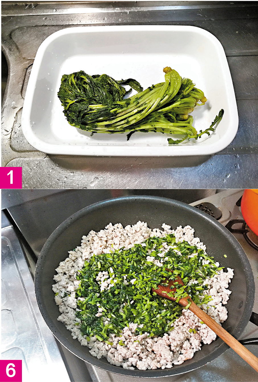5. 將雪菜放入鑊與碎豬肉拌炒均勻、盛出即成雪菜肉鬆;(放雪櫃可保存約5-7天,配粥粉麵飯或作炒菜輔料。)