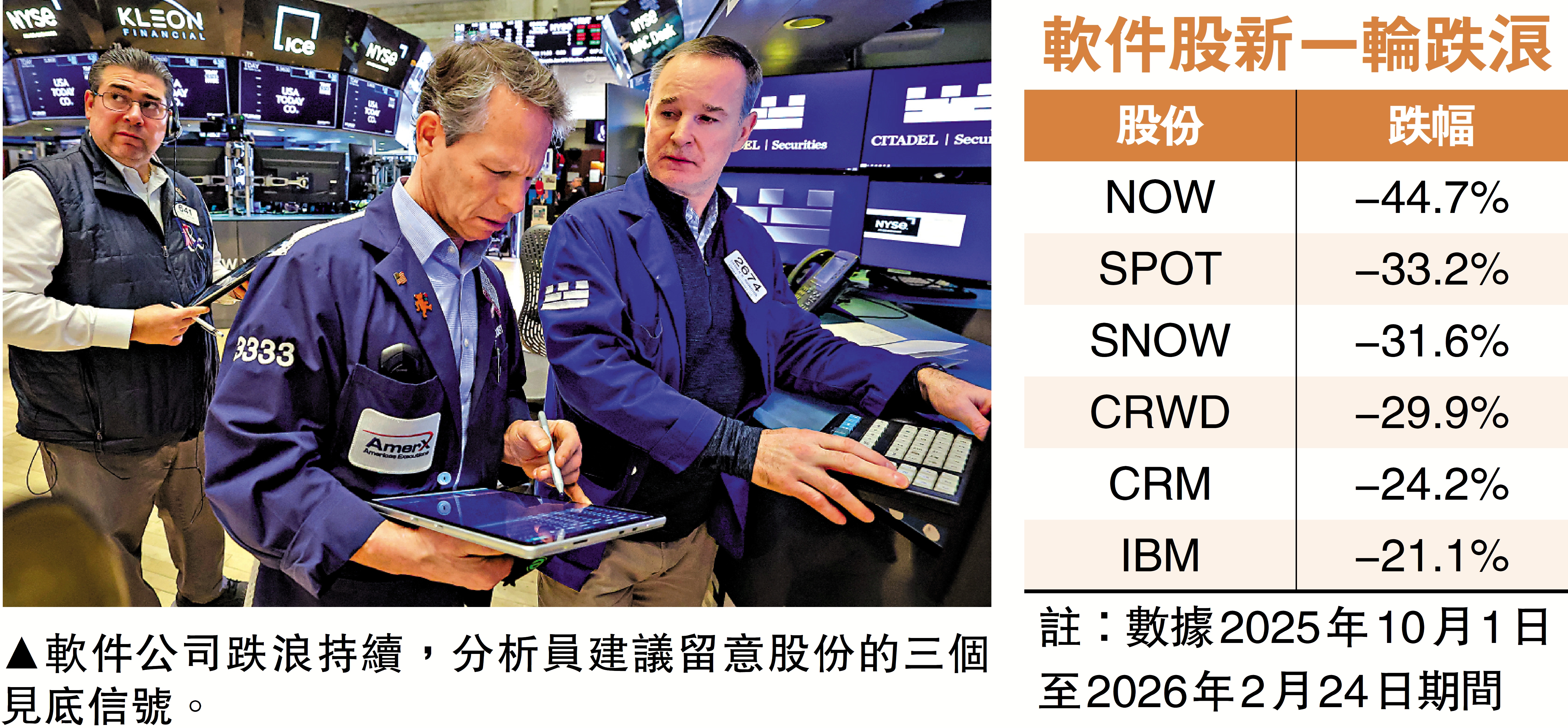 光大證券國際證券策略師伍禮賢直言,現時難以判斷最終受益於AI技術的軟件公司。若果投資者對軟件股有興趣,三個信號顯示股價有可能見底。第一個信號是,股價在漫長跌浪中,呈一底高於一底形態。第二個信號是,股價由快速下跌、成交量急增,轉變為股價下跌、成交量愈來愈小,恐慌情緒或逐步紓緩;並且股價回升,成交額增加,顯示資金重新流入。第三個信號是,股價由低於長期平均線(例如200天線),轉為高於長期平均線,跌勢有可能反轉。