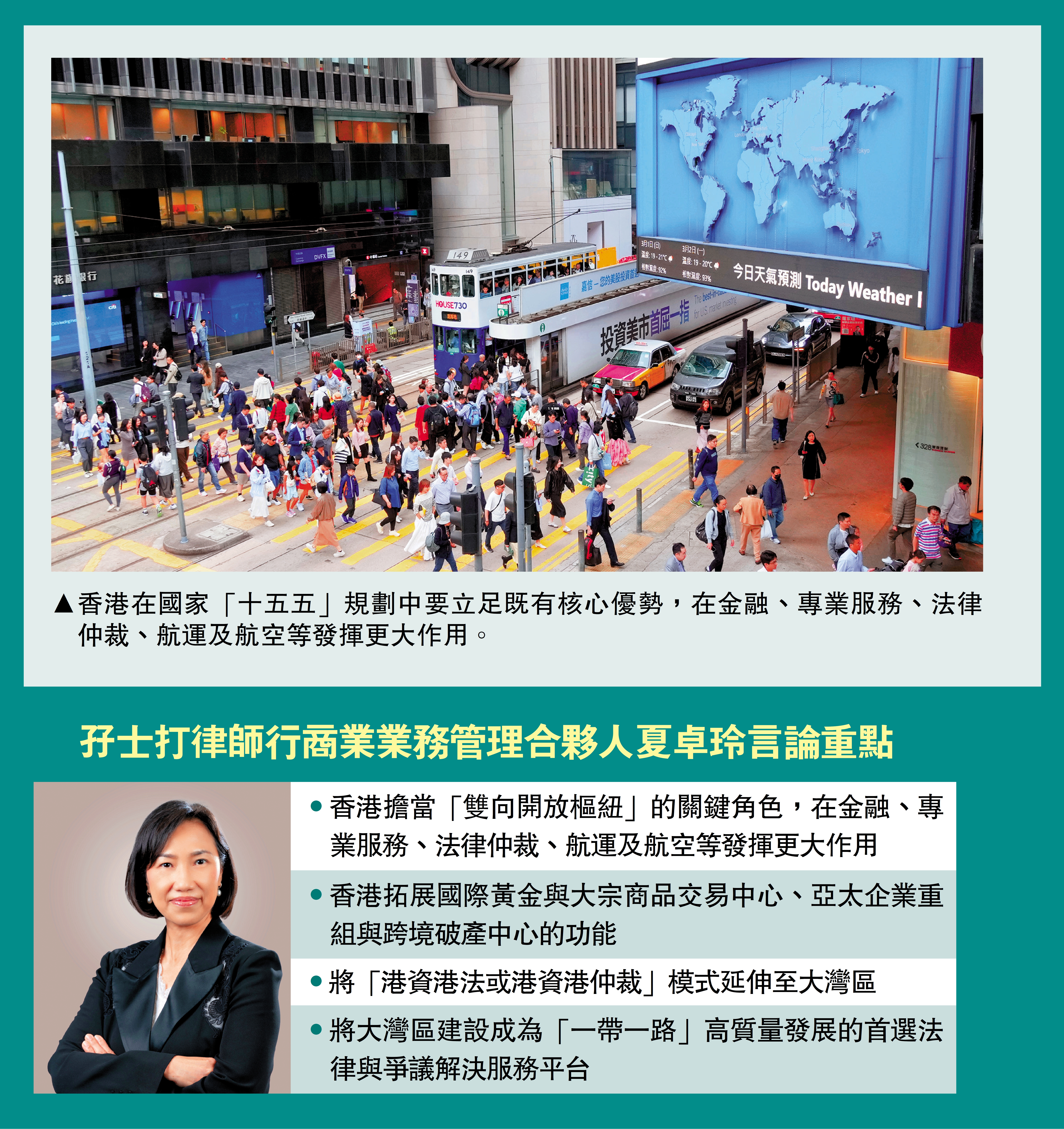 今年是「十五五」規劃開局之年,香港在國家發展大局所擔當的角色備受市場關注。孖士打律師行商業業務管理合夥人夏卓玲表示,香港要立足既有核心優勢,持續擔當「雙向開放樞紐」的關鍵角色,在金融、專業服務、法律仲裁、航運及航空等發揮更大作用。