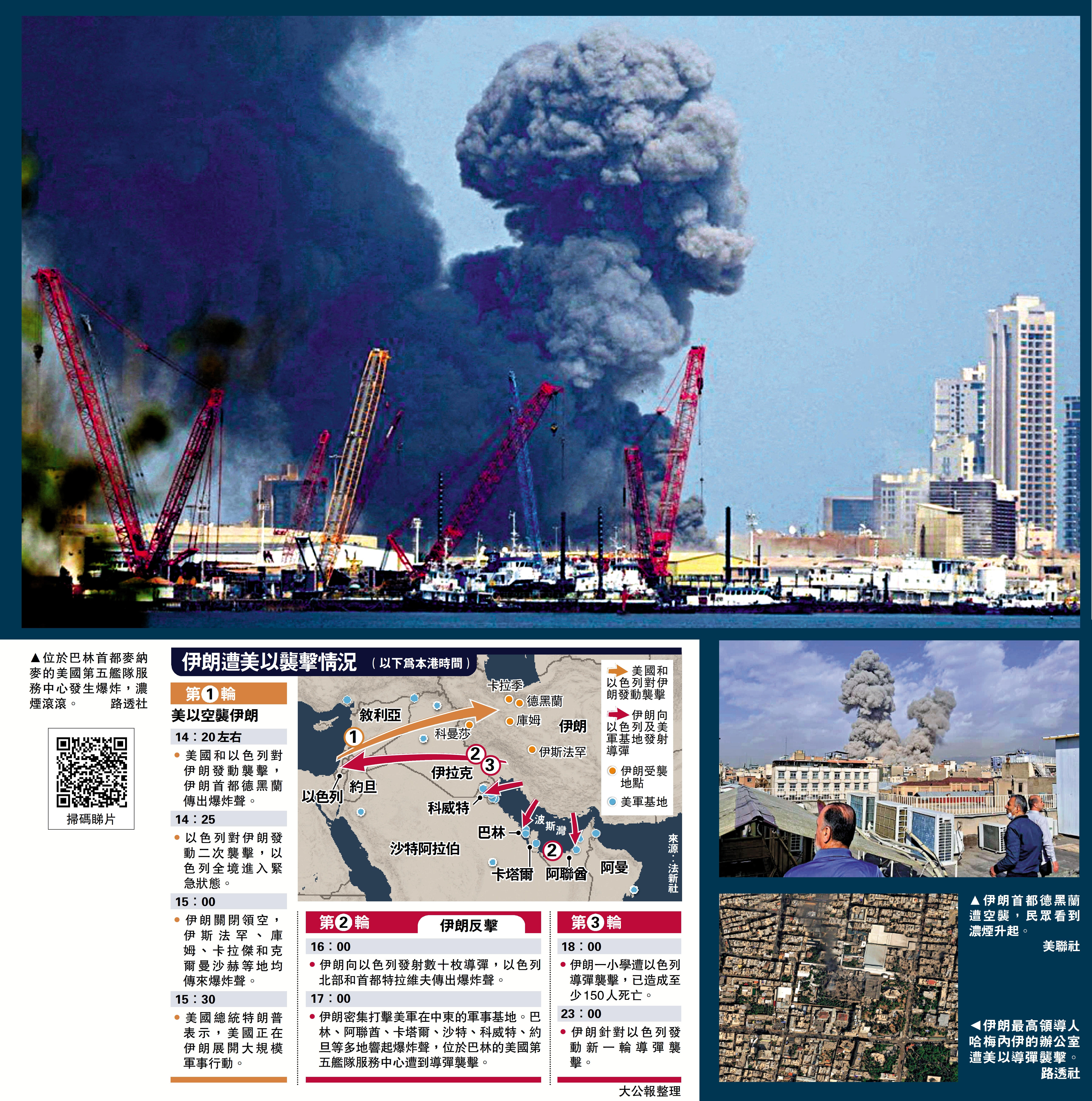【大公報訊】當地時間上午9時50分(本港時間14時20分),伊朗首都德黑蘭突然傳出巨大的爆炸聲,部分地區的手機通訊出現中斷。與此同時,以色列宣布,美國與以色列聯手對伊朗進行襲擊,以色列全境拉響防空警報。美、以的「戰斧」導彈密集穿過伊拉克飛向伊朗方向,除了德黑蘭,伊朗的多個城市包括伊斯法罕、庫姆和克爾曼沙赫也遭遇導彈襲擊。