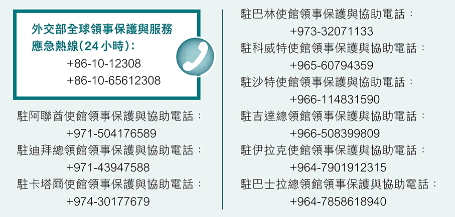 另外,外交部「領事直通車」3月1日發布:2月28日,美國、以色列對伊朗發動軍事行動,伊朗軍隊對美國在中東地區的軍事基地實施打擊,伊朗部分周邊國家關閉領空、國際航班停飛。已有中國公民在襲擊中受傷,部分臨時旅行人員滯留當地。