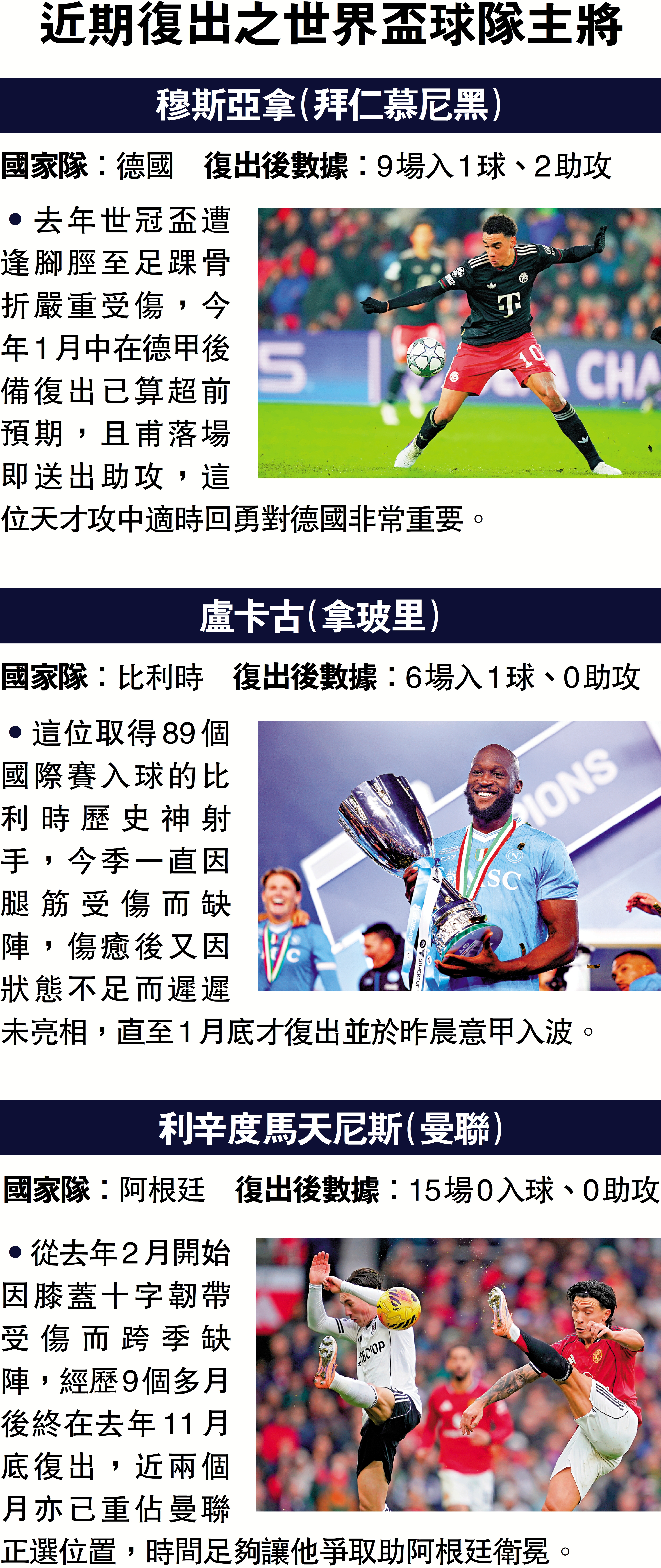 •從去年2月開始因膝蓋十字韌帶受傷而跨季缺陣,經歷9個多月後終在去年11月底復出,近兩個月亦已重佔曼聯正選位置,時間足夠讓他爭取助阿根廷衛冕。