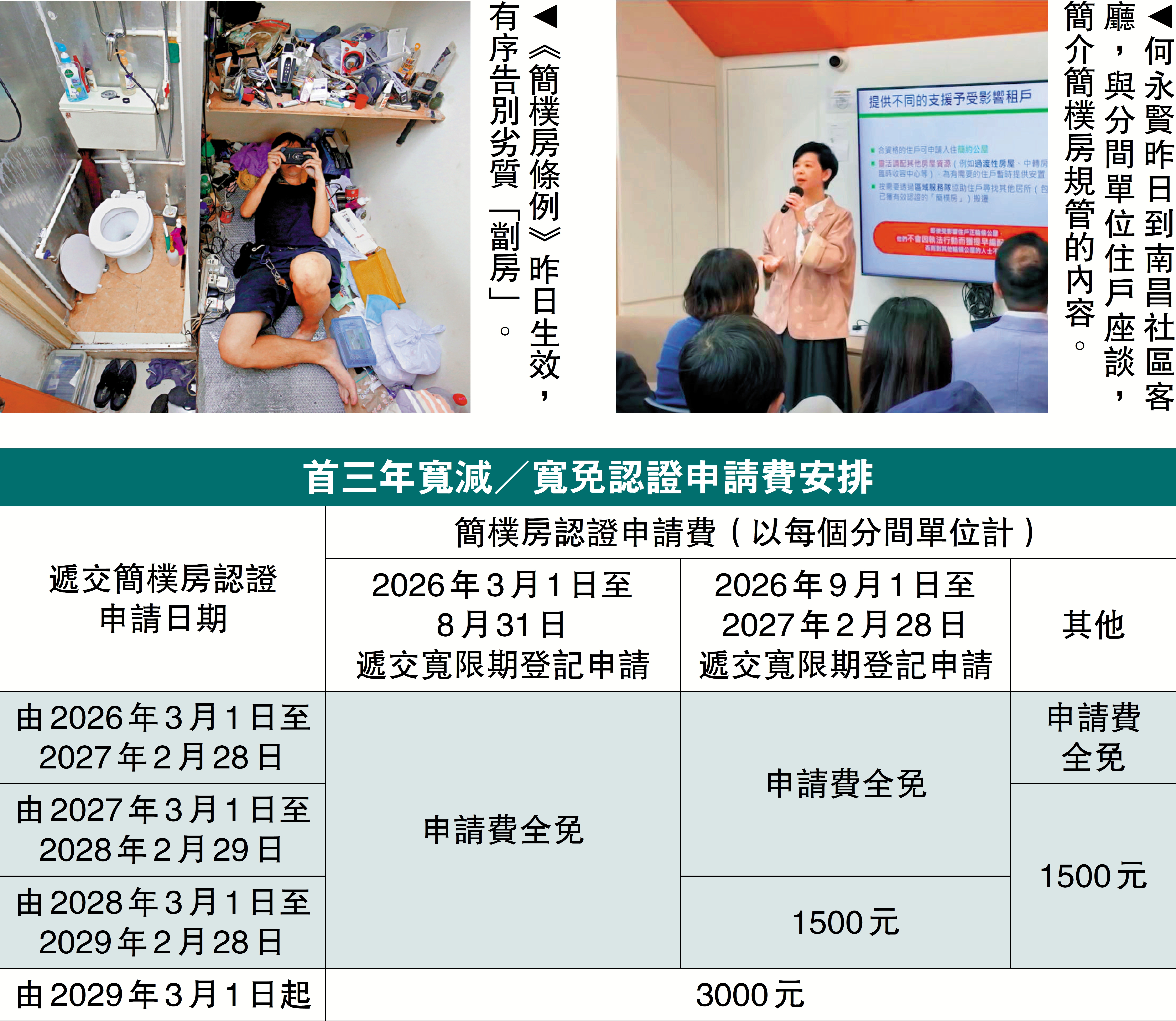 何永賢昨日在社交專頁撰文,透露昨日聯同立法會議員鄭泳舜和魏明德,及多位深水埗區議員到南昌社區客廳,與分間單位住戶座談,並簡介簡樸房規管的內容。她指出,過渡性房屋已特設丙類申請,專供在簡樸房規管期間受影響租戶申請入住,且有六隊區域服務隊專門支援居民。
